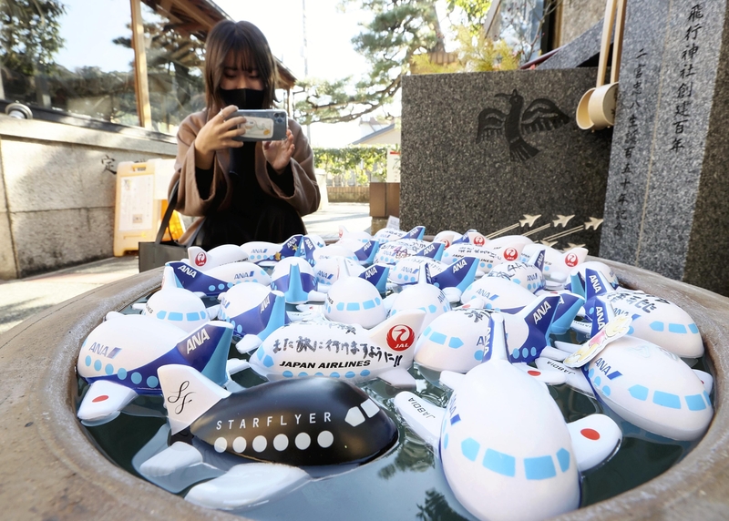 Toy airplanes float in a water basin at the aviation-linked Hiko Shrine in Yawata, Kyoto Prefecture, as a sign of support for the pandemic-hit airline industry. Some of the planes have messages written on their sides, such as, "I hope coronavirus is contained and moves on," and "I wish for the success of the airline industry."