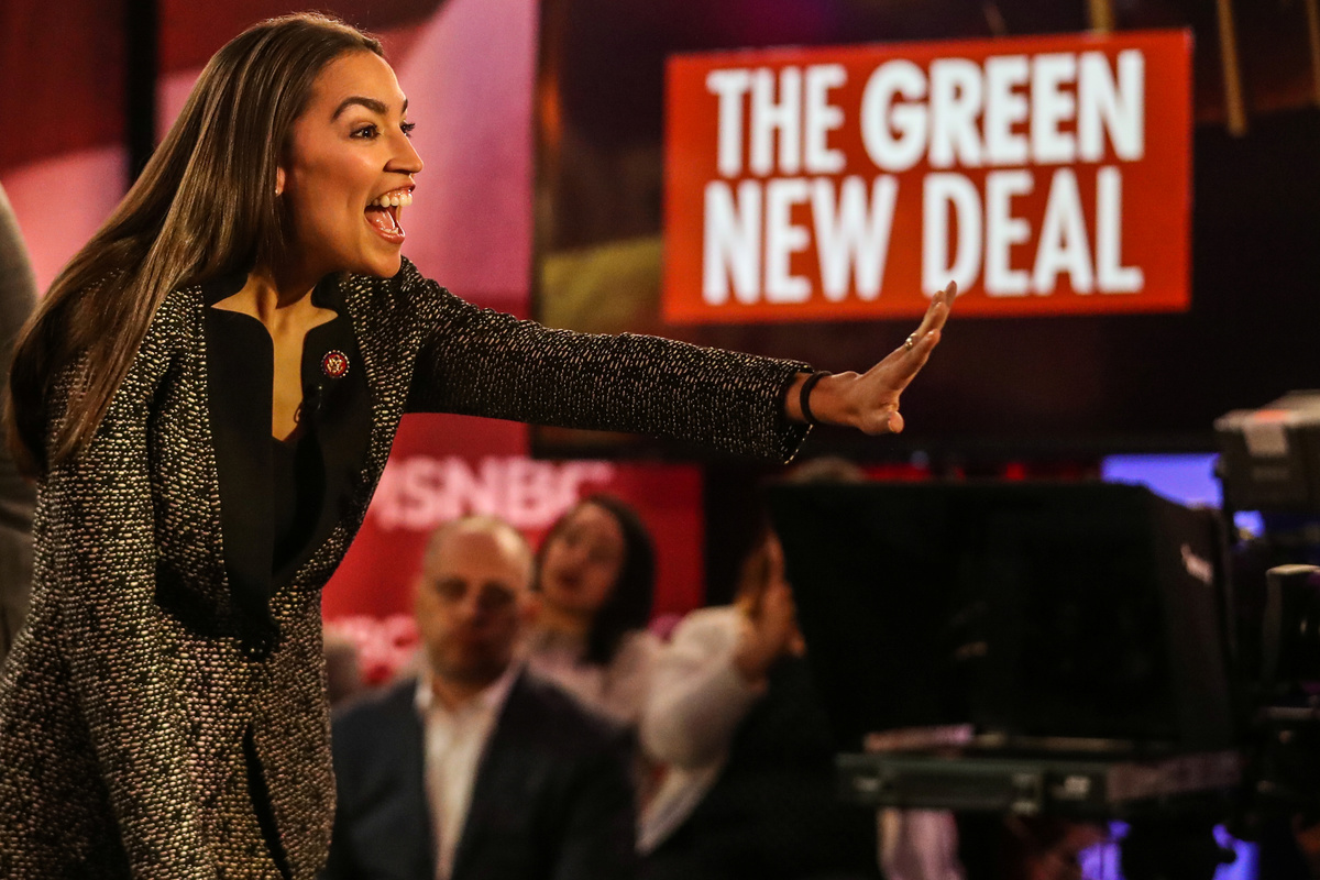 The Sunrise Movement first made waves after the 2018 midterm elections by holding a sit-in with Ocasio-Cortez outside the office of incoming Speaker of the House Nancy Pelosi, demanding that Congress adopt a Green New Deal.