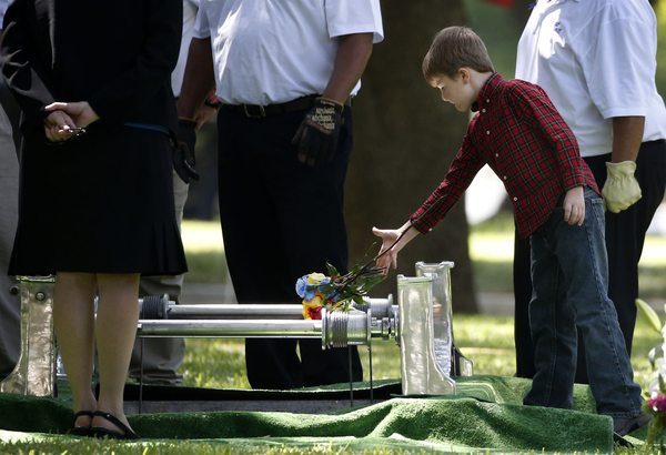 When the family arrived, Hill sat by Ahrens' mother's side as the honor guard fired rifles and delivered her a flag. Scores of police stood at attention throughout, the cemetery hushed as wind stirred the canopy of oaks.