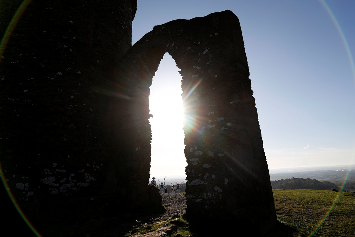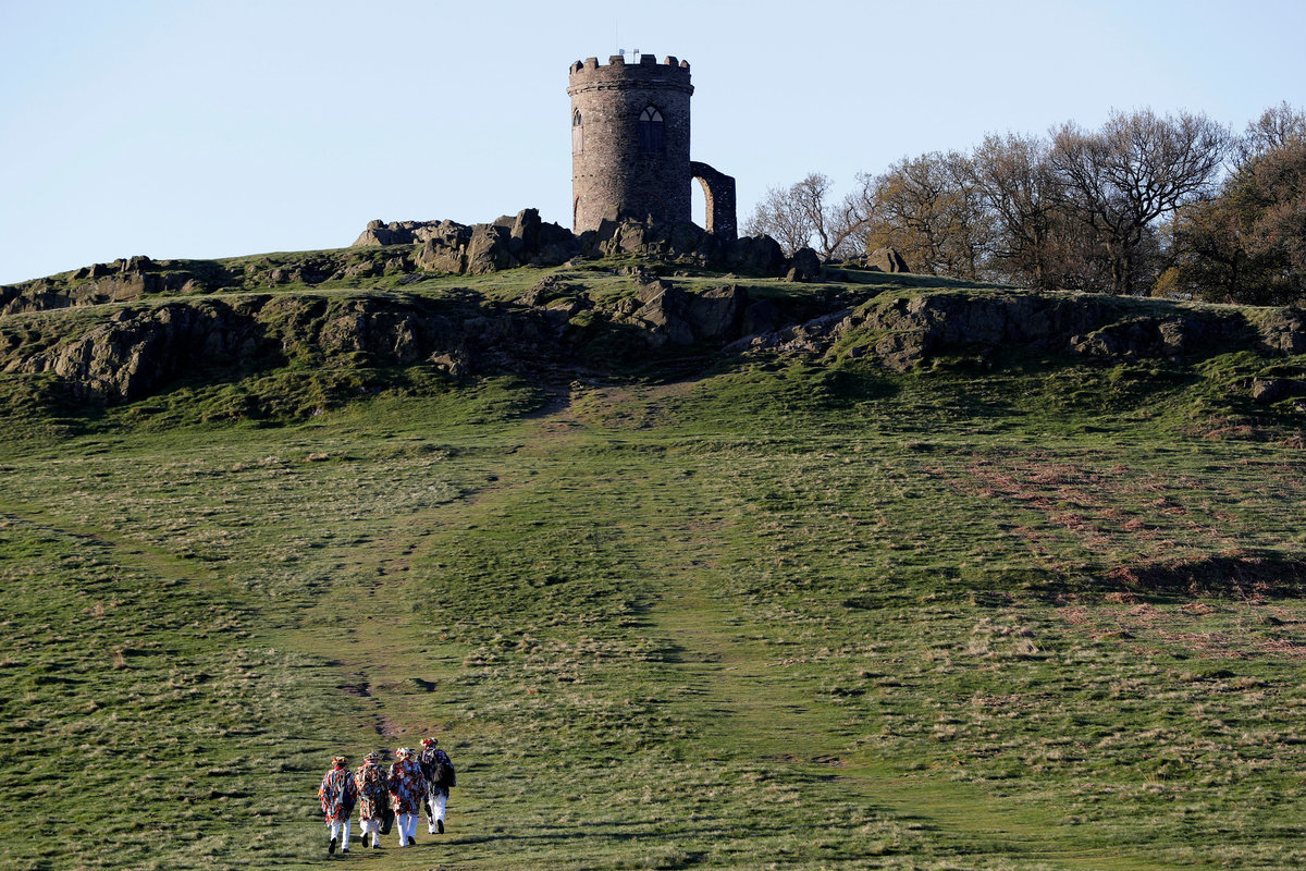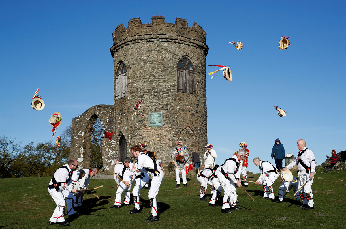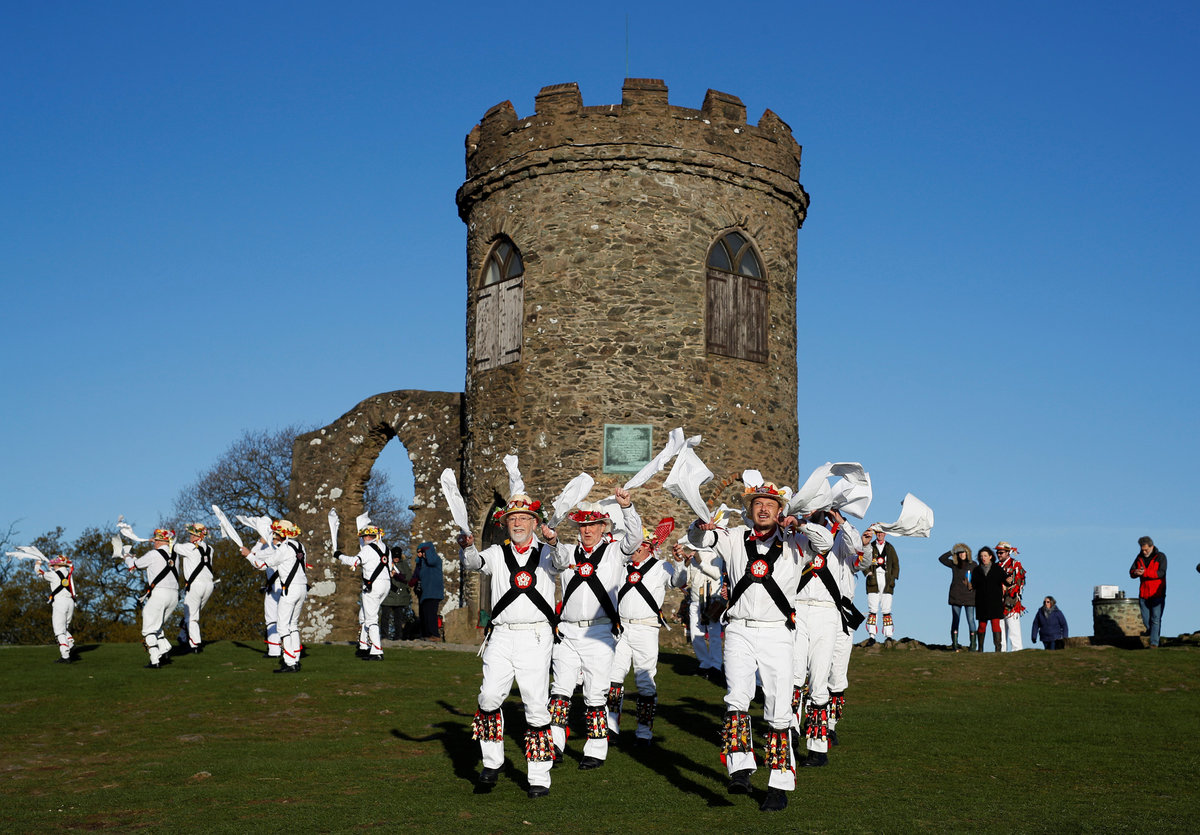 Around a dozen Leicester Morrismen danced with white rags to a fiddler in the shadow of a folly known as Old John in Bradgate Park, Newton Linford, about 100 miles north of London.