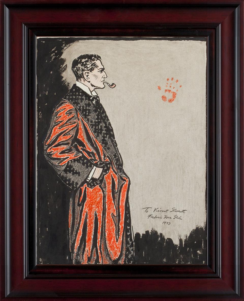 Some of the objects merit inclusion for their aesthetic appeal, such as iconic drawings by Frederick Dorr Steele that still inform people’s perceptions of the detective’s appearance and demeanor. Equally beguiling is a generous selection of pirated editions revealing the myriad ways in which unscrupulous publishers sensationalized the cerebral detective. Between the pipe-smoking gentleman gracing Steele’s chaste magazine illustrations and the scantily-clad women animating book covers in the unauthorized Great American Detective Series, you can see how Conan Doyle managed to reach an astonishingly large swathe of late 19th and early 20th century readers. Given the right presentation, Sherlock Holmes could appeal to practically anybody’s taste.