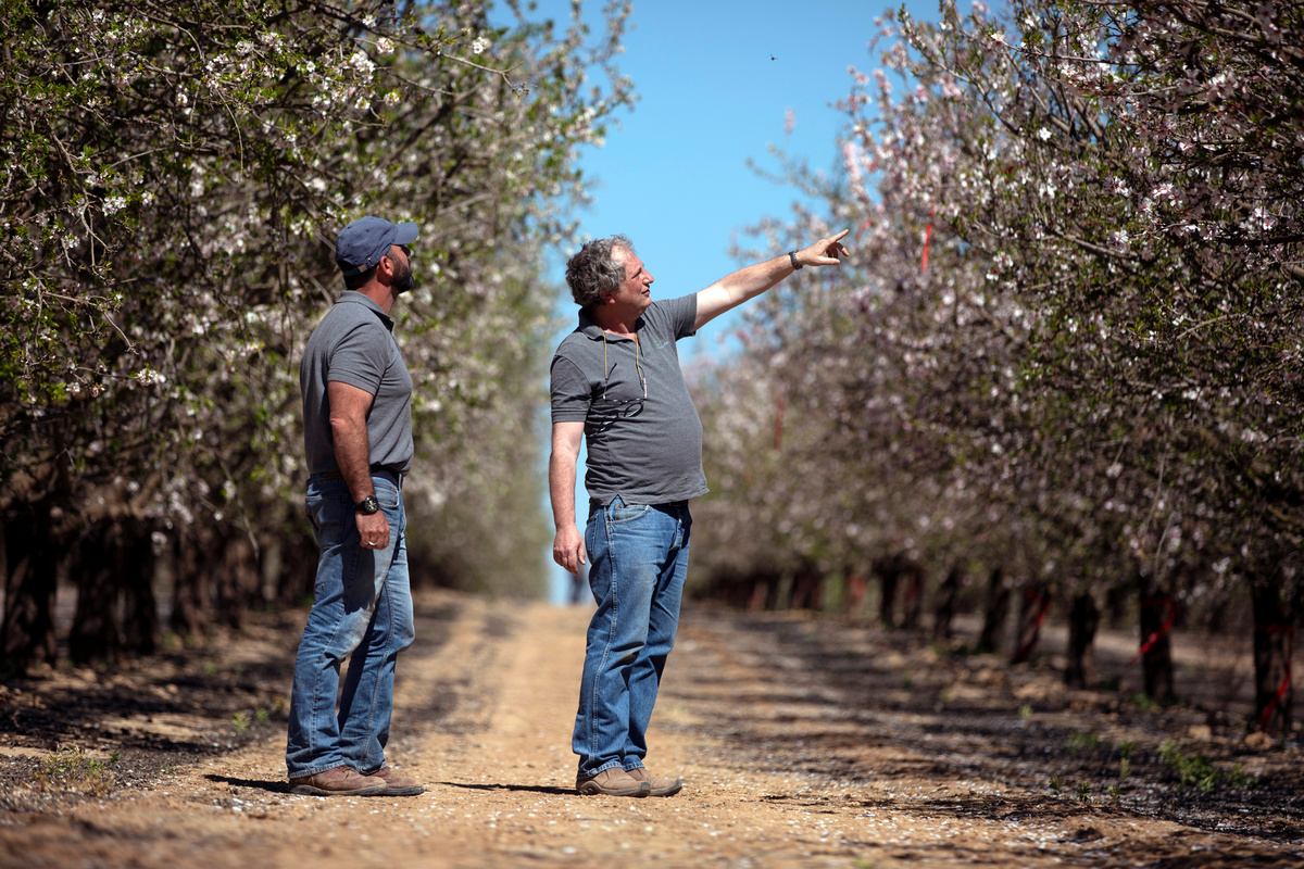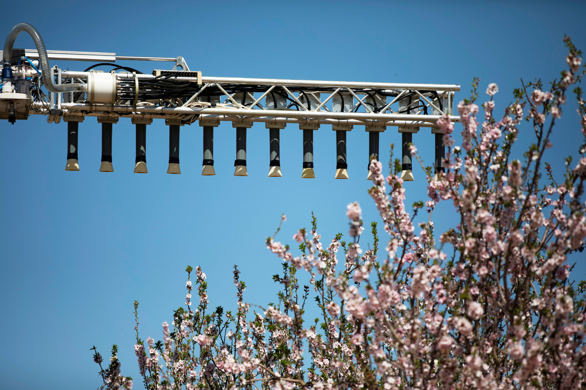 Through an almond orchard in the area of Tel Arad in a desert plain in southern Israel, a tractor pulled a mast equipped with about a dozen small cannon that fired precise shots of pollen at the trees, enabling them to fertilize.