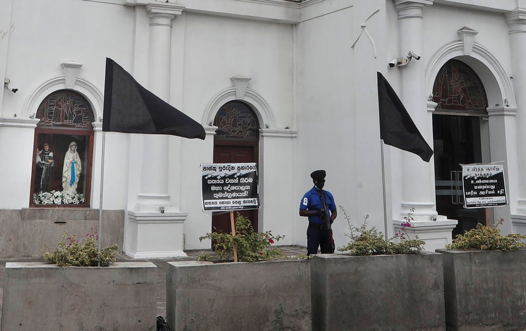 Under cloudy skies, a row of large black flags billowed in the wind Saturday in front of St. Anthony’s Church, which was targeted in the 2019 attacks. Behind a concrete barrier, religious statues overlooked armed police and signs that read: “Hiding the truth is a grand political conspiracy.”