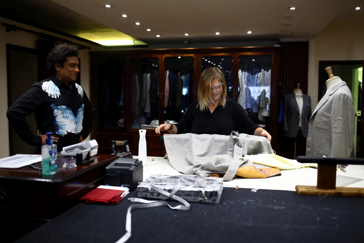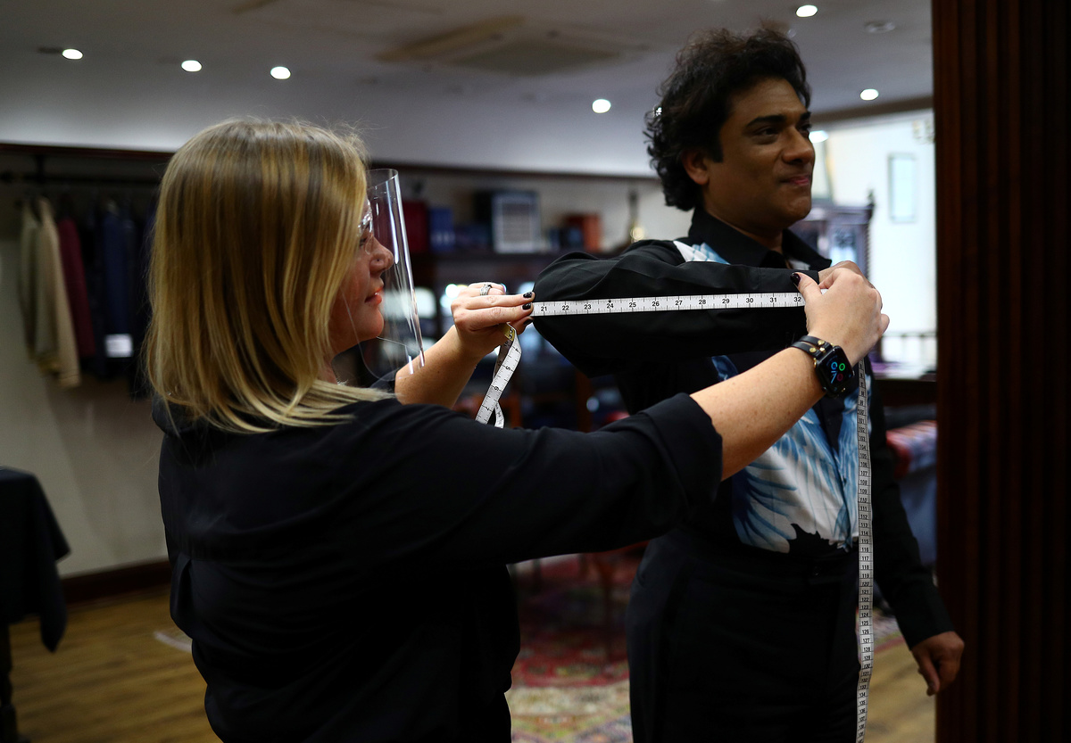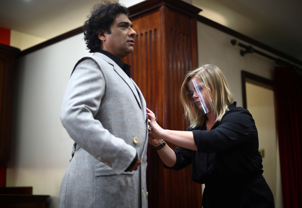 Standing in front of dozens of suit jackets in old-fashioned glass cabinets, Latchman keeps still while his chest is measured by shop manager Judith Ekblom Jarrold wearing a plastic face visor.