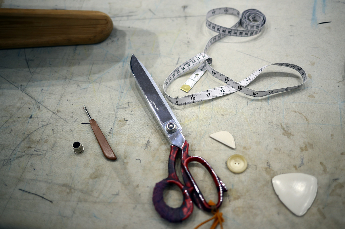 Fabric scissors and tools are seen on a work bench in Maurice Sedwell tailors on Saville Row, as the business reopens after an extended lockdown due to the spread of the coronavirus disease (COVID-19) in London, Britain, June 19, 2020. REUTERS/Hannah McKay