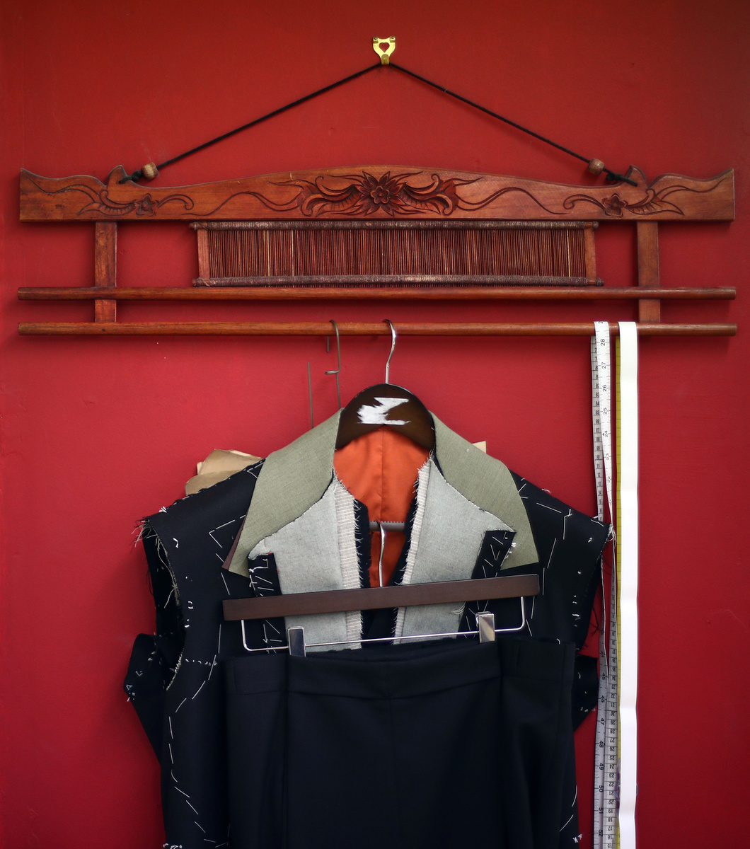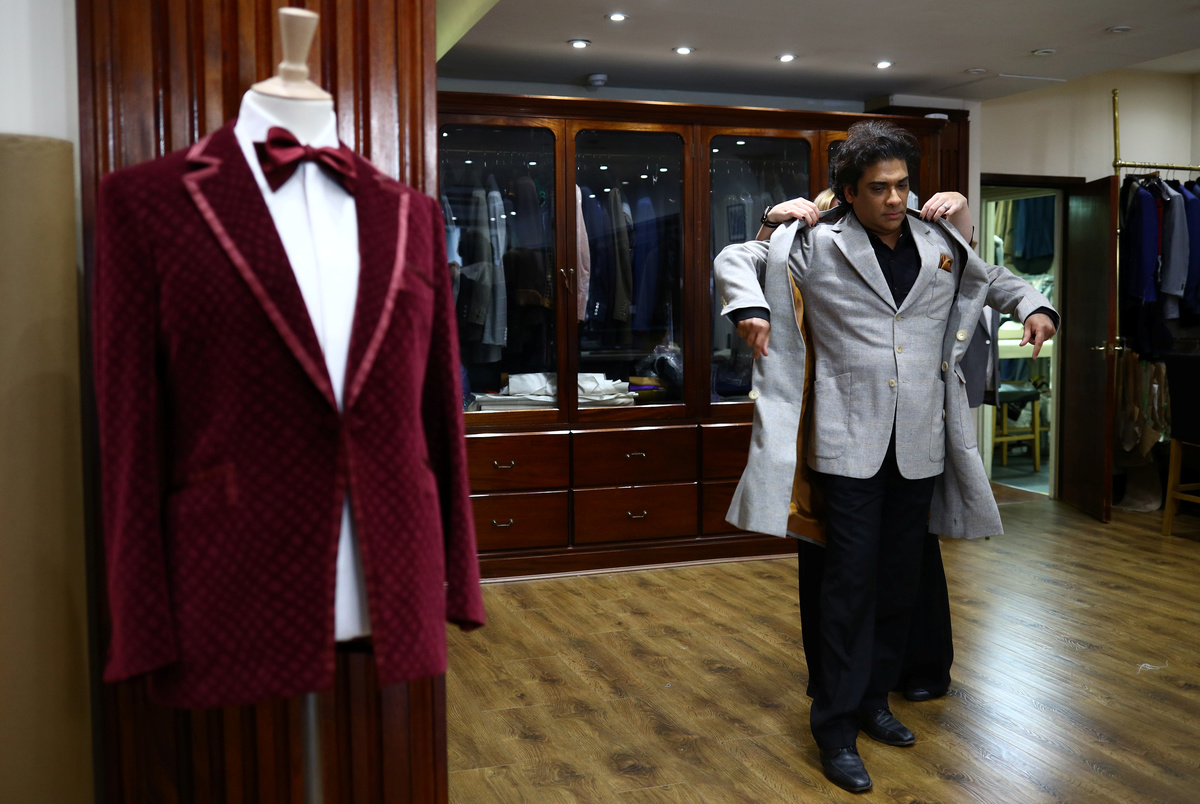 Behind a heavy red curtain, Neil Latchman checks the fit of a suit made especially for him by Maurice Sedwell, a tailors which has been making bespoke clothes in London since 1938.
