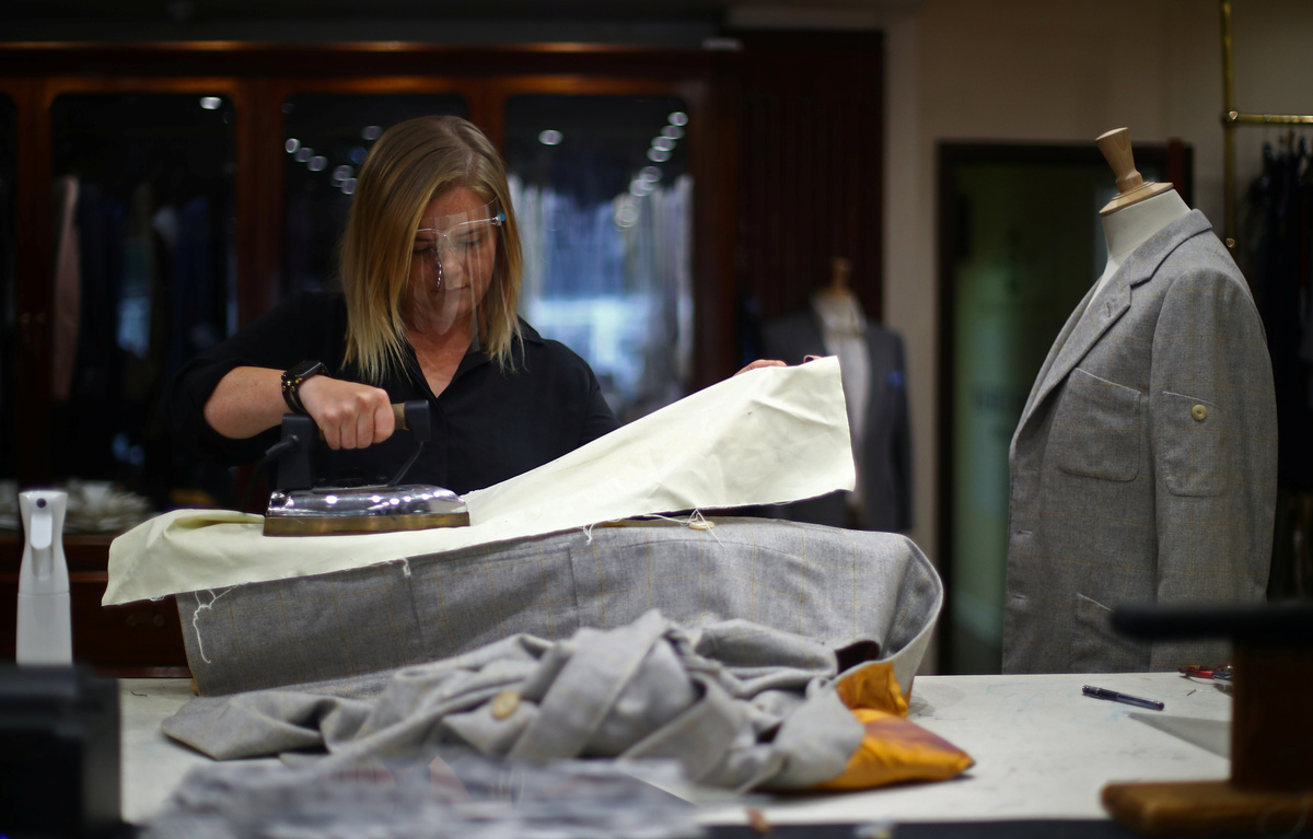 Tailor Judith Ekblom Jarrold presses a bespoke jacket for a customer in Maurice Sedwell tailors on Saville Row, as the business reopens after an extended lockdown due to the spread of the coronavirus disease (COVID-19) in London, Britain, June 19, 2020. REUTERS/Hannah McKay