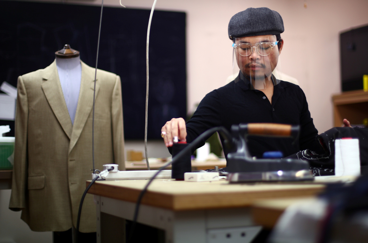 Maurice Sedwell's tailors cut and sew fabrics like vicuna and cashmere for customers including politicians and business leaders, and despite the safety precautions of visors and gloves, Ekblom Jarrold says it is mostly business as usual.