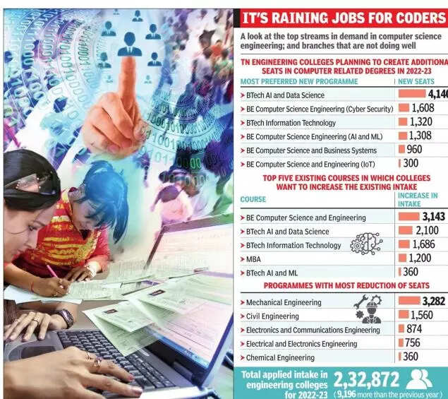 To meet the demand, around 140 engineering colleges have sought to increase their existing intake in computer science engineering, IT, AI (artificial intelligence) and data science programmes by more than 5000 seats. Meanwhile, 190 colleges have applied to Anna University to start new courses such as computer science and engineering (Cyber Security), computer science and engineering (AI and Machine Learning) among others.