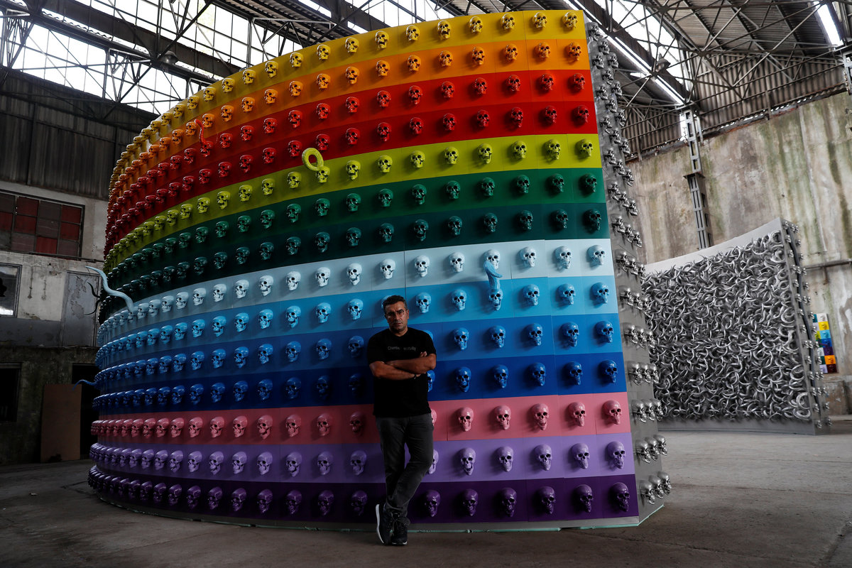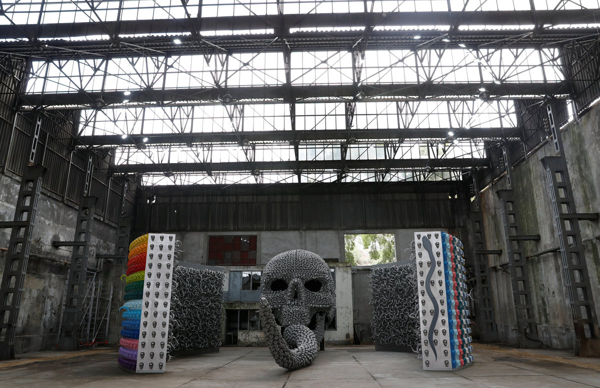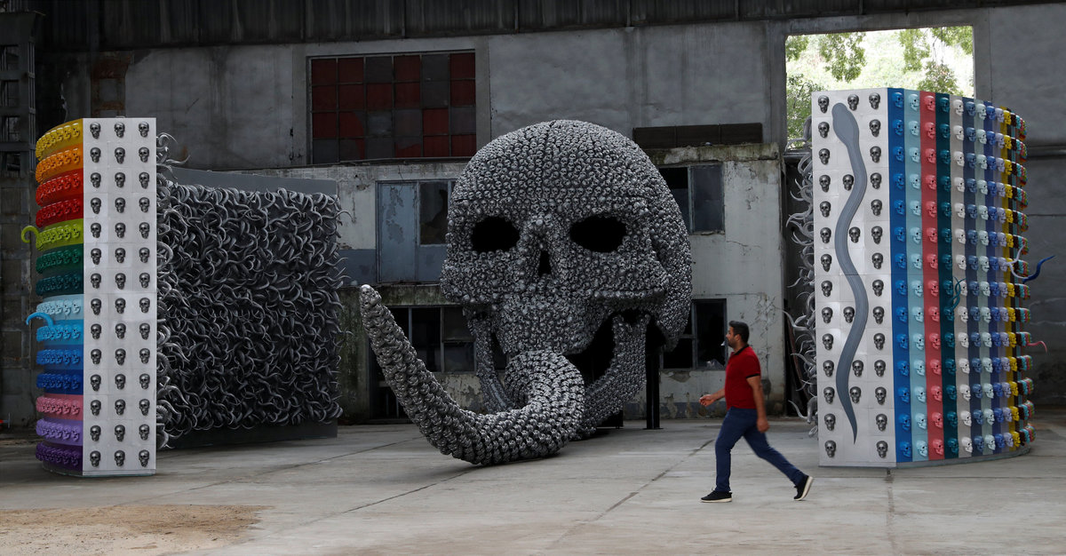 ISTANBUL (Reuters) - In a disused hangar in Istanbul, Turkish artist Ahmet Gunestekin uses thousands of metal human skulls and twisting, spiky animal horns to re-tell some ancient myths in a towering, fearsome installation.