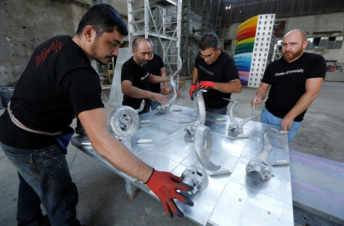 Turkish artist Ahmet Gunestekin, accompanied by his team members, puts finishing touches to his artwork "Chamber of Immortality" in Istanbul, Turkey September 5, 2018. Picture taken September 5, 2018. REUTERS/Murad Sezer