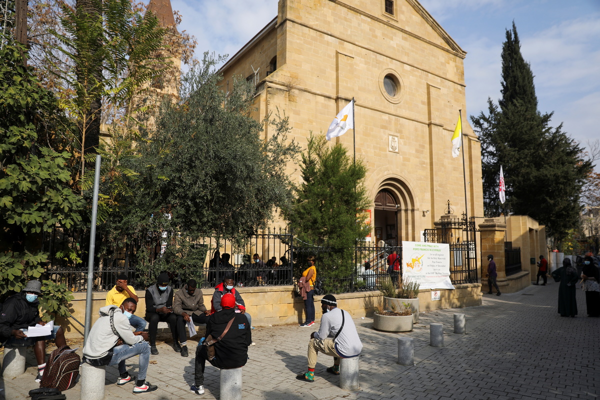 In central Nicosia, nothing tells the story of an influx in arrivals more than the small courtyard area outside the Church of the Holy Cross. Each morning migrants queue for aid and assistance from a Catholic charity.