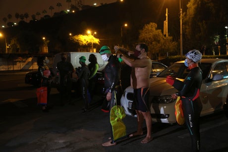 The swimmers began gathering even before dawn glimmers on Pescadores beach, plunging into the Pacific surf for one of the few athletic endeavors permitted under Peru's strict pandemic restrictions.