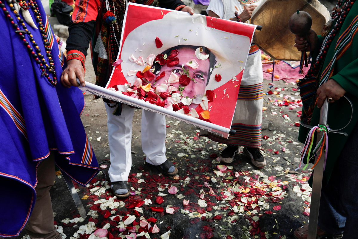The shamans had photos of the candidates over which they blew smoke while shaking rattles and blowing a traditional wind instrument known as a pututo or caracola. Others threw flower petals or poked at the photos with metal swords.