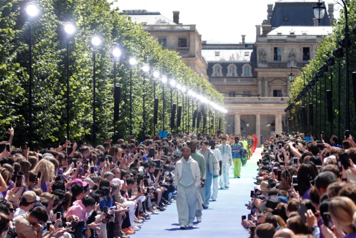 The kaleidoscope effect was also present on the edges of the catwalk, with 3,000 fashion students and Vuitton workers wearing colored T-shirts flanking the runway.