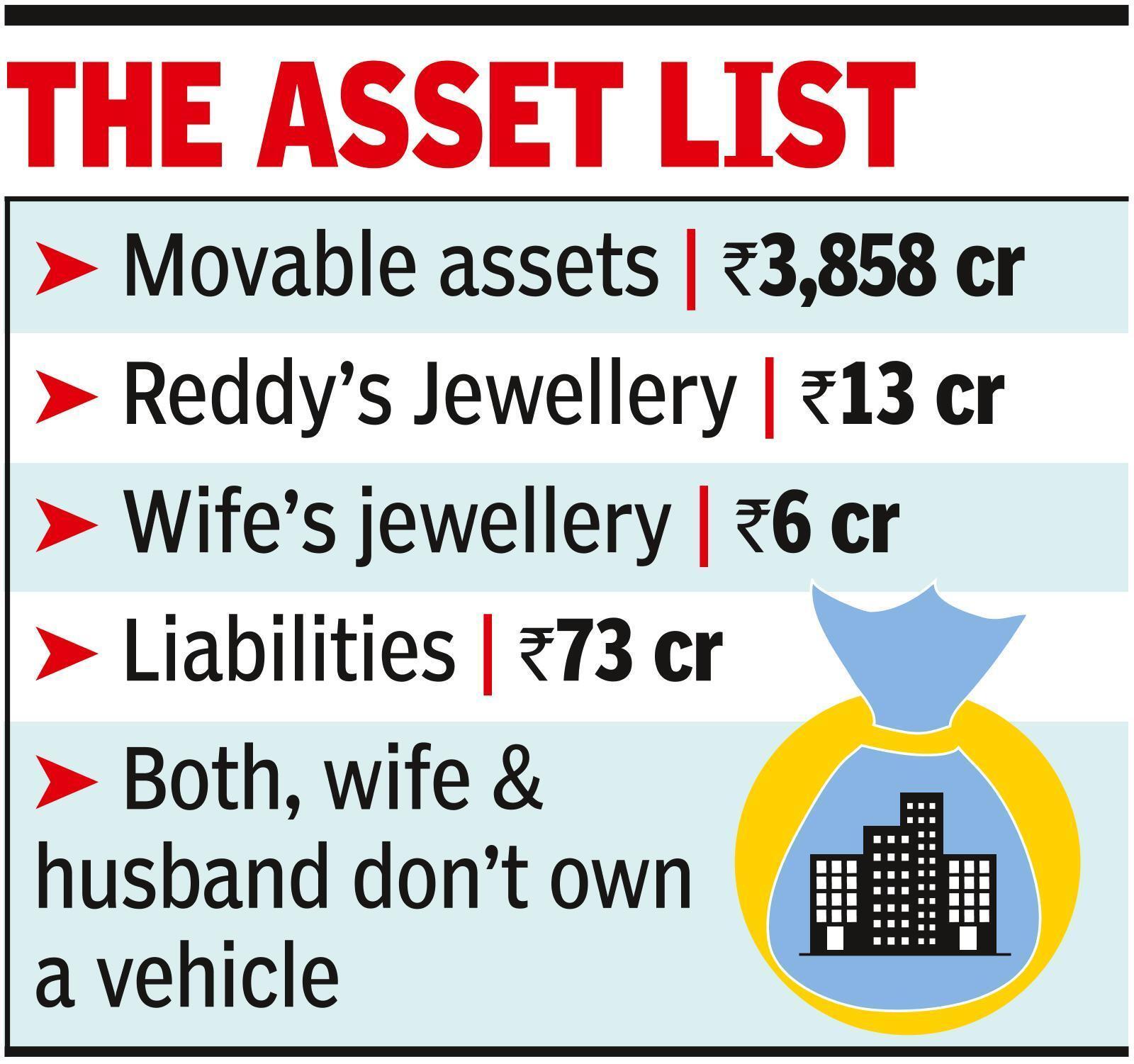 Out of movable assets of Rs 3,858 crore, around Rs 3,407 crore are shares of Partha Saradhi Reddy. While out of Rs 1,249 crore, around Rs 1,140 crore is of his wife and Rs 105 crore in HUF.