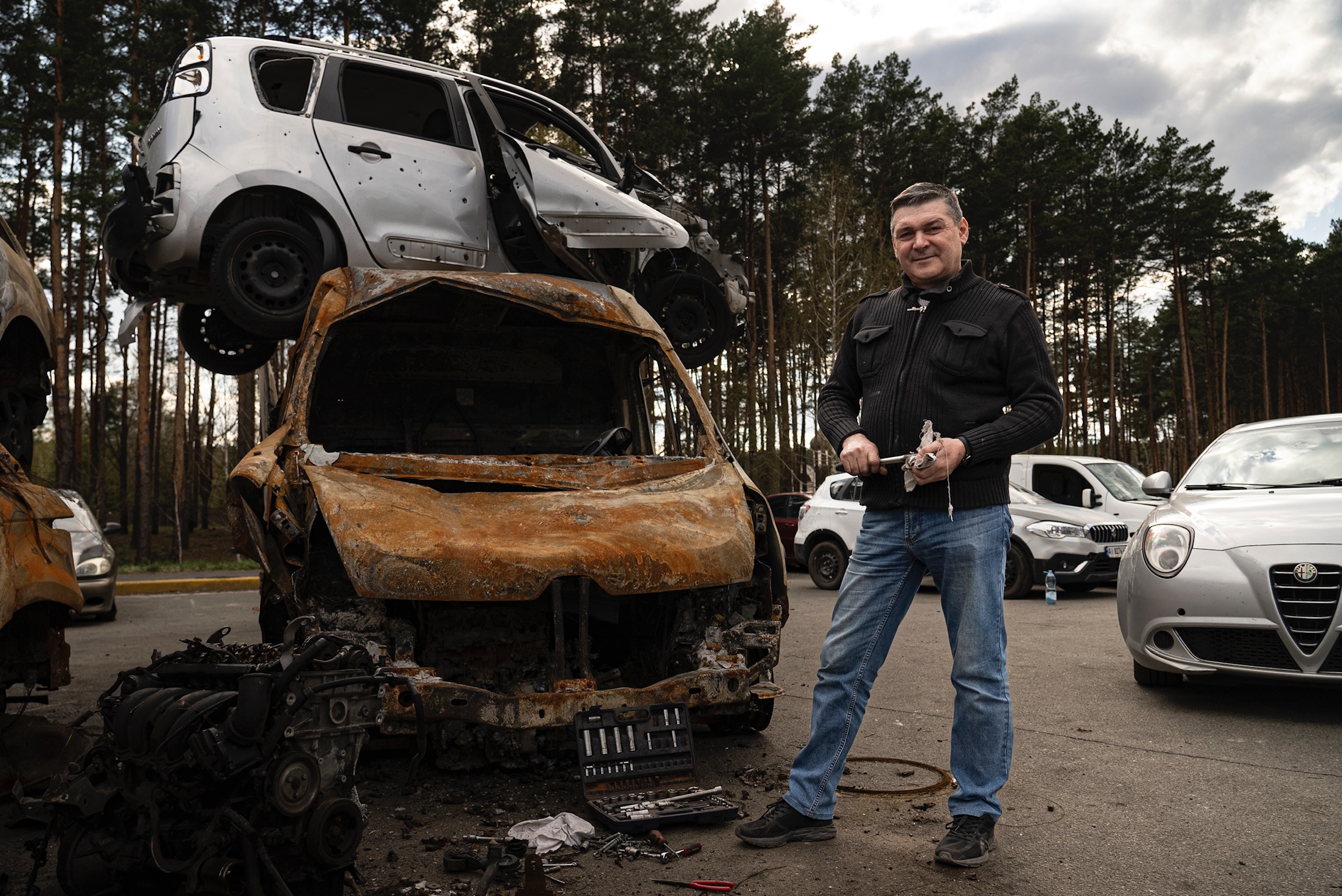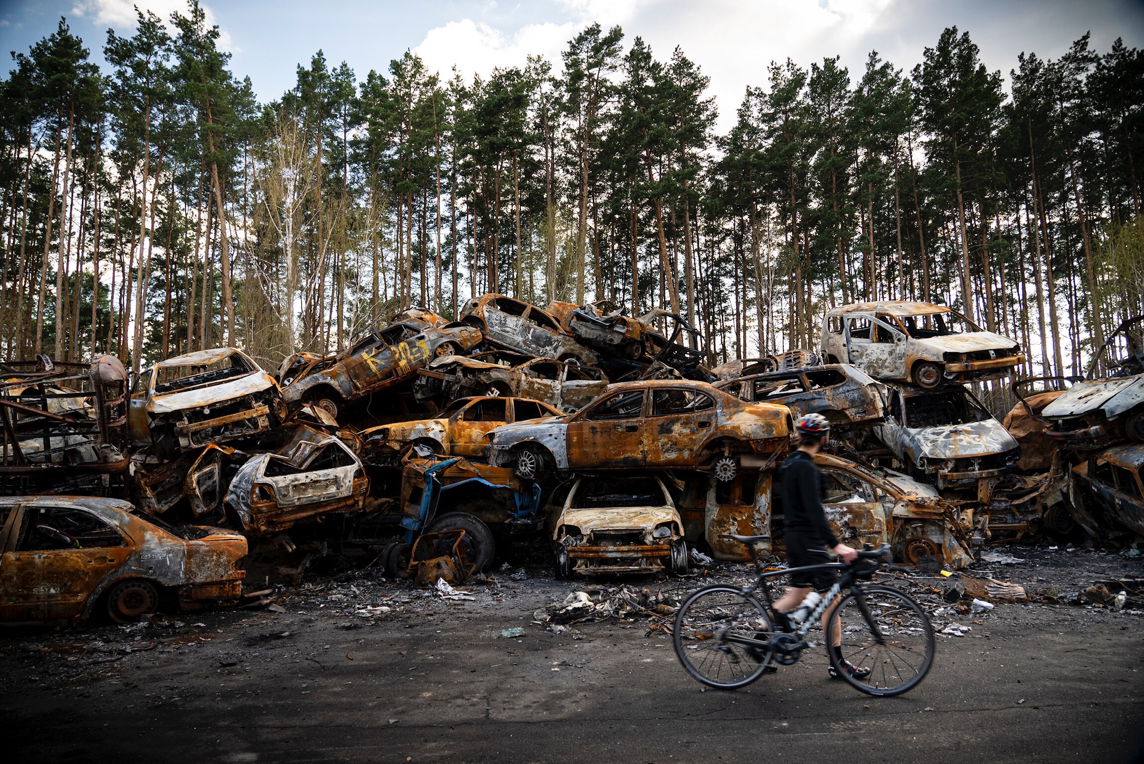 Many of the cars were shelled or peppered with bullets and other shrapnel when Russia attacked.
