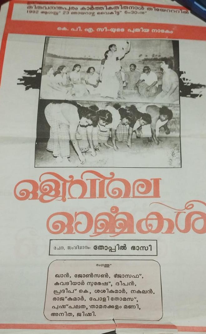 Olivile Ormakal was first staged at Karthika Thirunal Theatre, Thiruvananthapuram, on August 23, 1992, less than four months before Bhasi died.