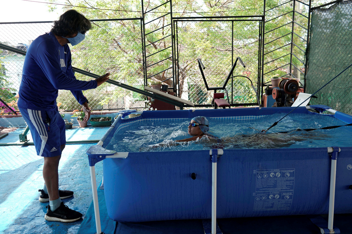 In one corner is the 3-meter long above-ground pool that her trainer's 9-year old daughter lent her when authorities closed down the Olympic-sized pools she usually trains in last month as the virus started to spread in the Caribbean country.