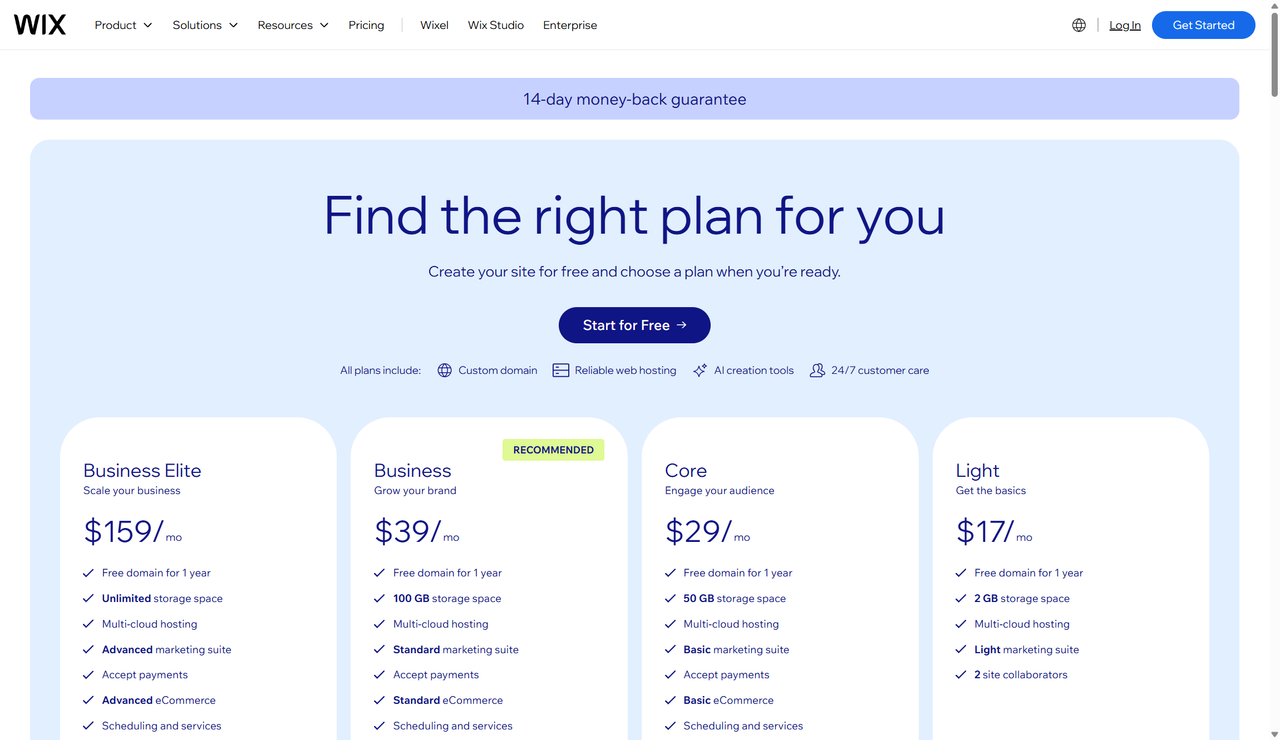 The best Wix plan depends on your needs. The free plan is great for practicing or creating simple personal sites. The Light plan ($19/month) works for portfolios and basic business websites. Small businesses needing basic ecommerce features might prefer the Core plan ($27/month), while the Business plan ($34/month) suits businesses with larger online stores. For organizations with complex needs, the Business Elite plan ($159/month) provides more advanced resources.