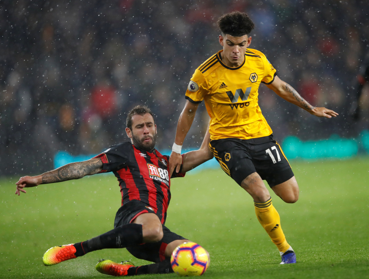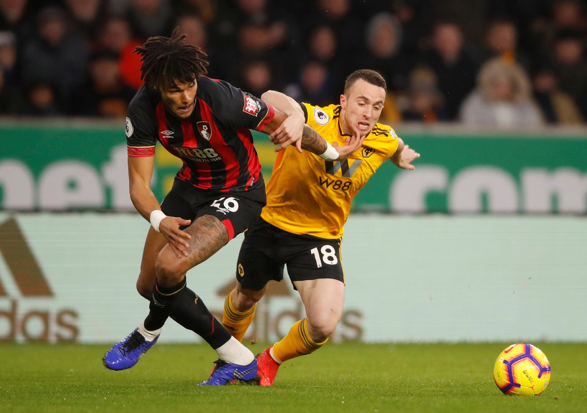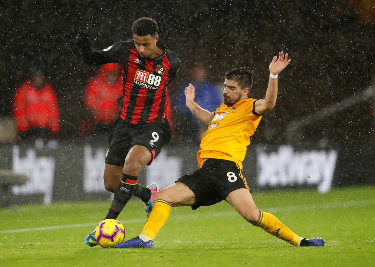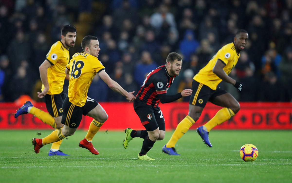 Soccer Football - Premier League - Wolverhampton Wanderers v AFC Bournemouth - Molineux Stadium, Wolverhampton, Britain - December 15, 2018 Bournemouth's Ryan Fraser in action with Wolverhampton Wanderers' Diogo Jota Action Images via Reuters/Carl Recine Soccer Football - Premier League - Wolverhampton Wanderers v AFC Bournemouth - Molineux Stadium, Wolverhampton, Britain - December 15, 2018 Bournemouth's Ryan Fraser in action REUTERS/Darren Staples Soccer Football - Premier League - Wolverhampton Wanderers v AFC Bournemouth - Molineux Stadium, Wolverhampton, Britain - December 15, 2018 Bournemouth's Lys Mousset in action with Wolverhampton Wanderers' Ruben Neves Action Images via Reuters/Carl Recine Soccer Football - Premier League - Wolverhampton Wanderers v AFC Bournemouth - Molineux Stadium, Wolverhampton, Britain - December 15, 2018 Bournemouth's Tyrone Mings receives medical attention after sustaining an injury Action Images via Reuters/Carl Recine Soccer Football - Premier League - Wolverhampton Wanderers v AFC Bournemouth - Molineux Stadium, Wolverhampton, Britain - December 15, 2018 Bournemouth's Joshua King shoots at goal REUTERS/Darren Staples
