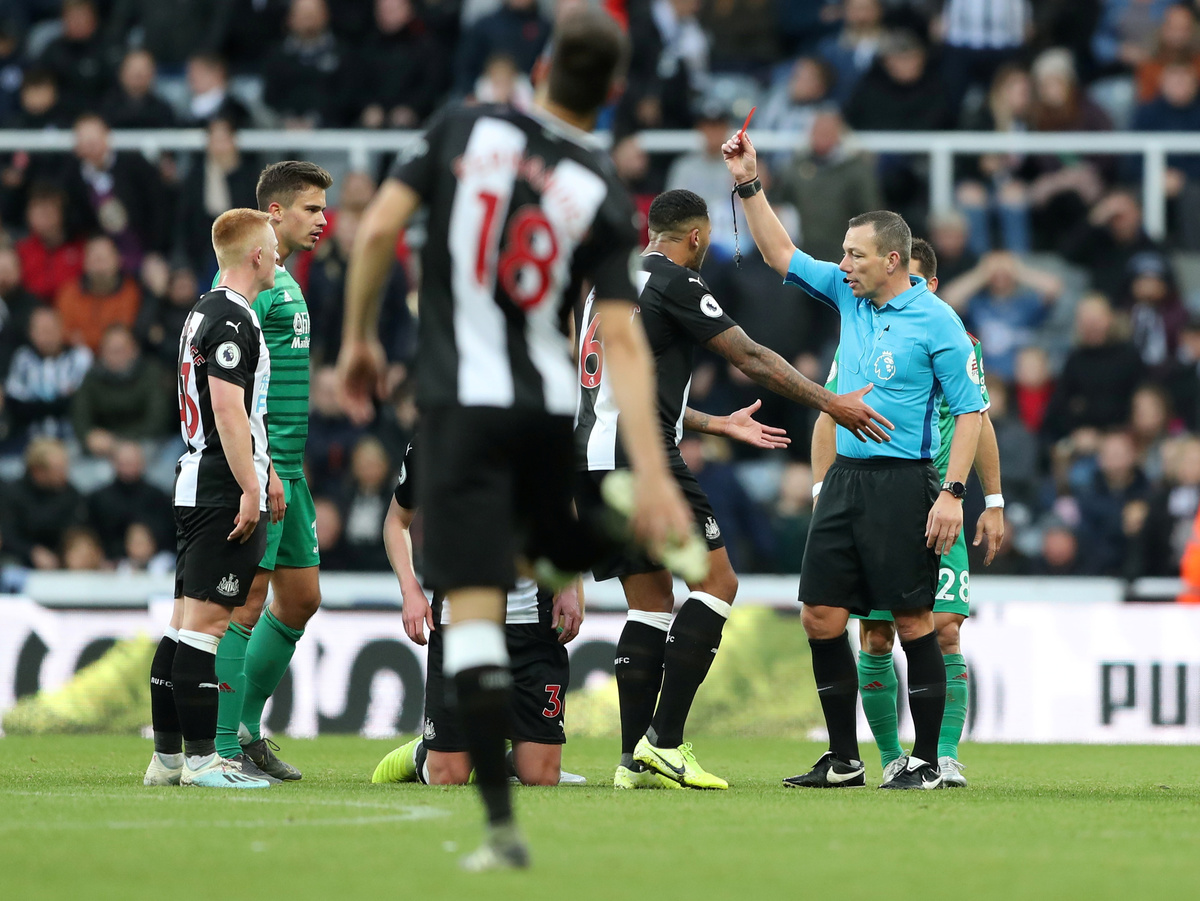 Soccer Football - Premier League - Newcastle United v Wolverhampton Wanderers - St James' Park, Newcastle, Britain - October 27, 2019 Newcastle United's Sean Longstaff is shown a red card by referee Kevin Friend REUTERS/Scott Heppell