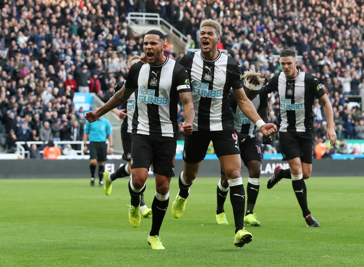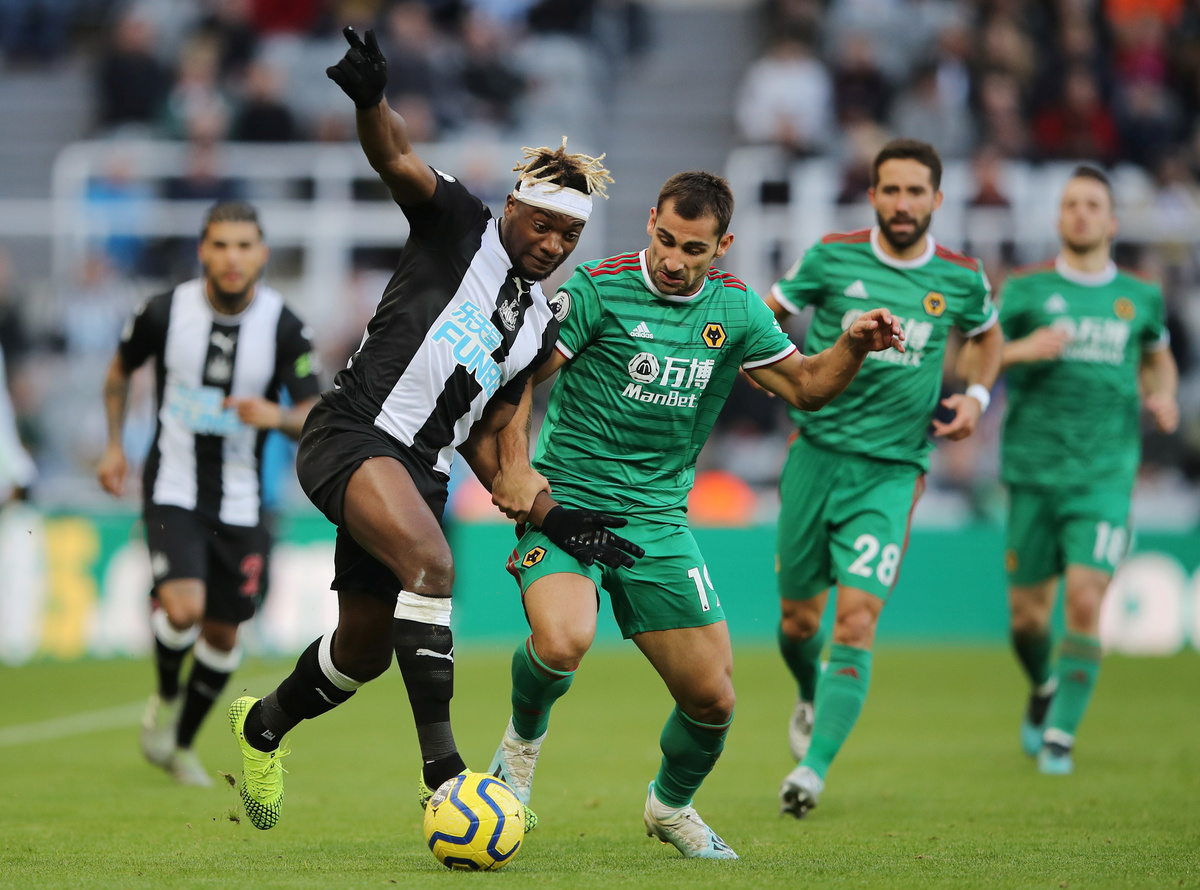 Soccer Football - Premier League - Newcastle United v Wolverhampton Wanderers - St James' Park, Newcastle, Britain - October 27, 2019 Newcastle United's Sean Longstaff in action with Wolverhampton Wanderers' Raul Jimenez REUTERS/Scott Heppell Soccer Football - Premier League - Newcastle United v Wolverhampton Wanderers - St James' Park, Newcastle, Britain - October 27, 2019 Newcastle United's Allan Saint-Maximin in action with Wolverhampton Wanderers' Ruben Neves Action Images via Reuters/Molly Darlington Soccer Football - Premier League - Newcastle United v Wolverhampton Wanderers - St James' Park, Newcastle, Britain - October 27, 2019 Newcastle United's Jamaal Lascelles in action with Wolverhampton Wanderers' Leander Dendoncker Action Images via Reuters/Molly Darlington Soccer Football - Premier League - Newcastle United v Wolverhampton Wanderers - St James' Park, Newcastle, Britain - October 27, 2019 Newcastle United's Jamaal Lascelles celebrates scoring their first goal with teammates REUTERS/Scott Heppell