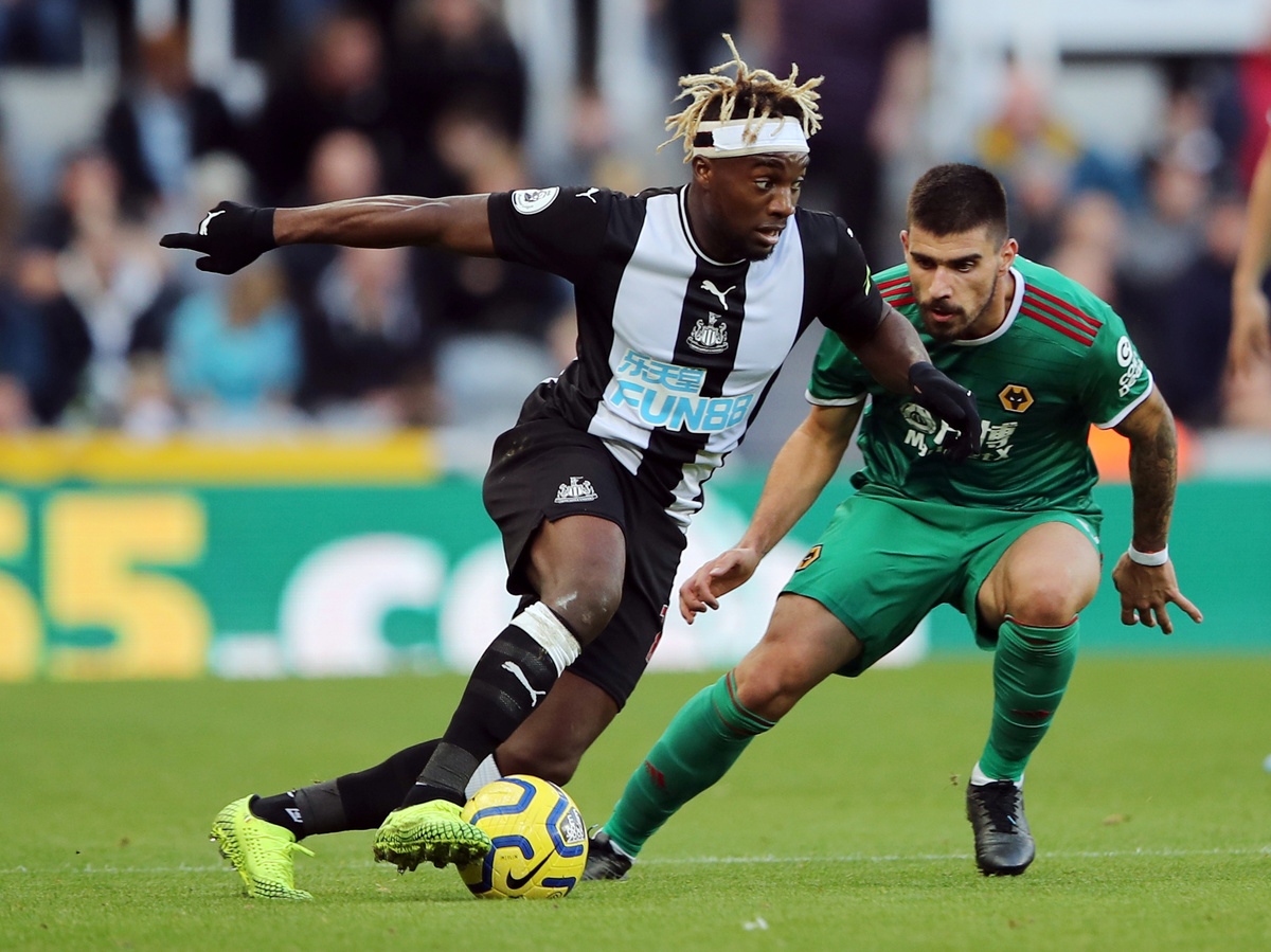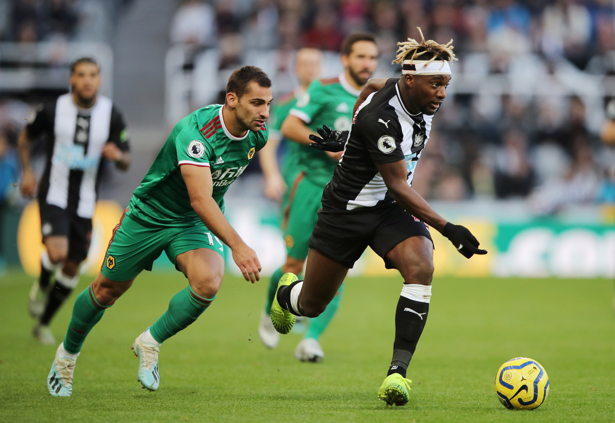 Soccer Football - Premier League - Newcastle United v Wolverhampton Wanderers - St James' Park, Newcastle, Britain - October 27, 2019 Newcastle United's Allan Saint-Maximin in action with Wolverhampton Wanderers' Jonny Action Images via Reuters/Molly Darlington