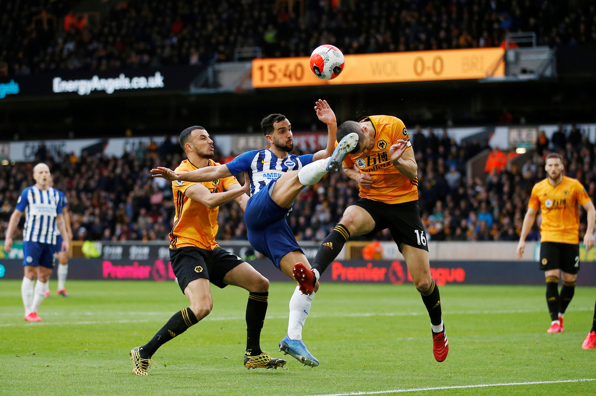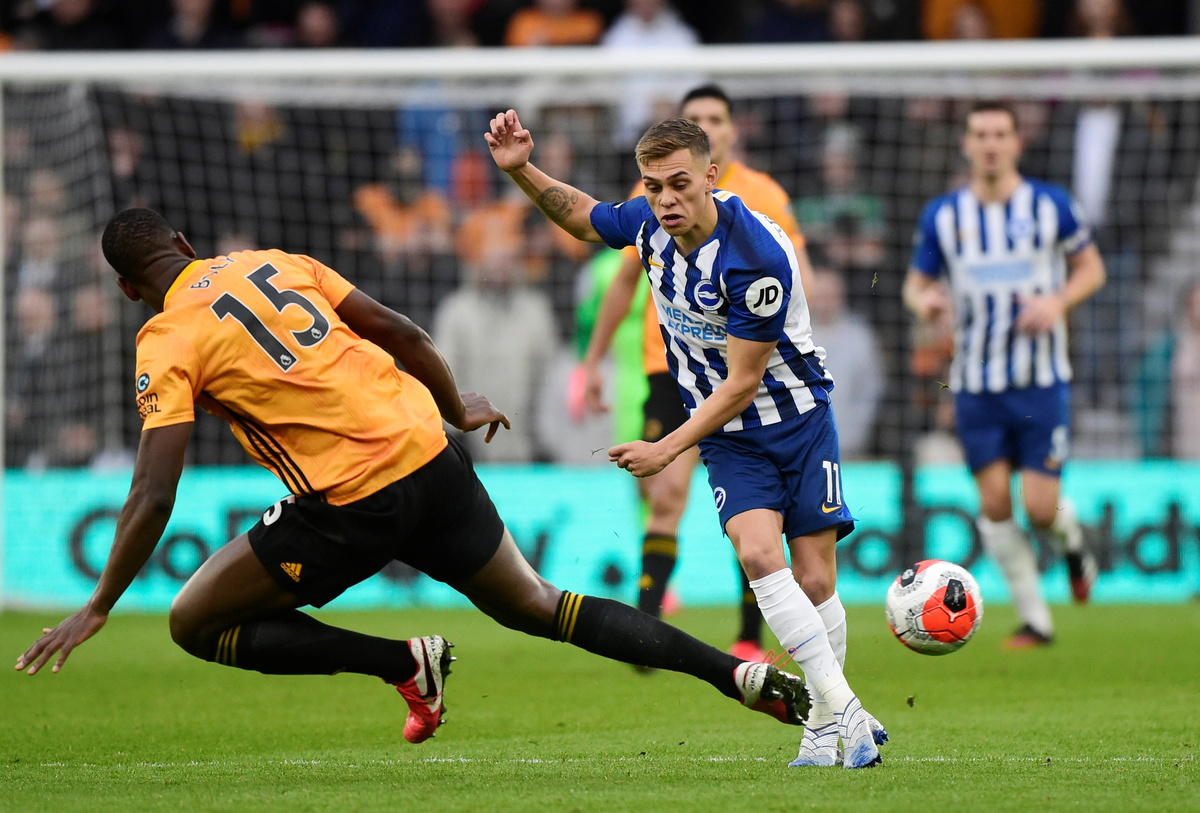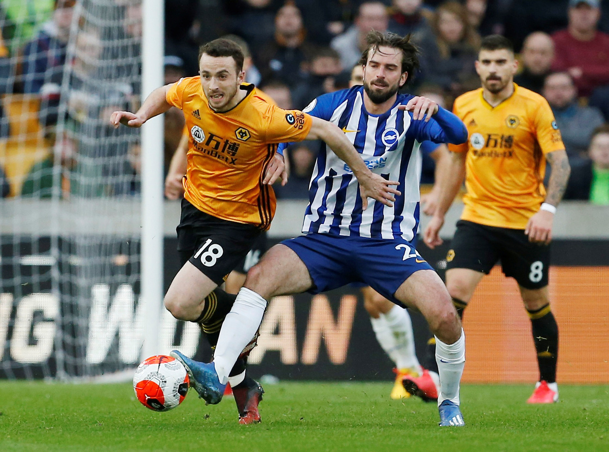 Soccer Football - Premier League - Wolverhampton Wanderers v Brighton & Hove Albion - Molineux Stadium, Wolverhampton, Britain - March 7, 2020 Brighton & Hove Albion's Davy Propper in action with Wolverhampton Wanderers' Diogo Jota Action Images via Reuters/Craig Brough