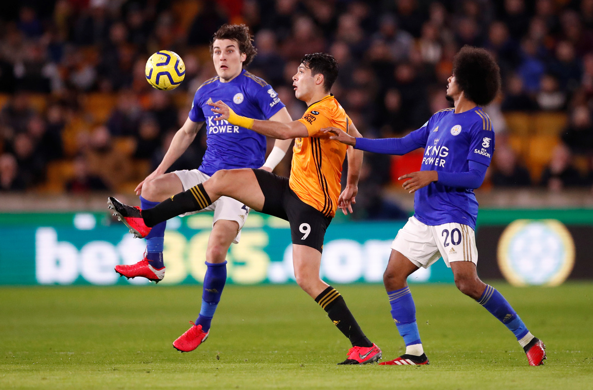 Soccer Football - Premier League - Wolverhampton Wanderers v Leicester City - Molineux Stadium, Wolverhampton, Britain - February 14, 2020 Wolverhampton Wanderers' Raul Jimenez in action with Leicester City's Hamza Choudhury and Caglar Soyuncu Action Images via Reuters/Andrew Boyers
