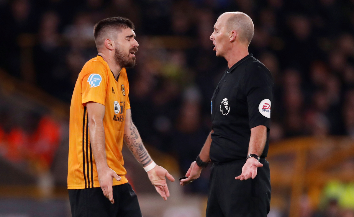 Soccer Football - Premier League - Wolverhampton Wanderers v Leicester City - Molineux Stadium, Wolverhampton, Britain - February 14, 2020 Leicester City's Harvey Barnes in action with Wolverhampton Wanderers' Matt Doherty REUTERS/Andrew YatesSoccer Football - Premier League - Wolverhampton Wanderers v Leicester City - Molineux Stadium, Wolverhampton, Britain - February 14, 2020 Wolverhampton Wanderers' Ruben Neves remonstrates with referee Mike Dean Action Images via Reuters/Andrew Boyers Soccer Football - Premier League - Wolverhampton Wanderers v Leicester City - Molineux Stadium, Wolverhampton, Britain - February 14, 2020 Wolverhampton Wanderers' Willy Boly scores their first goal which is later disallowed by VAR for offside REUTERS/Andrew Yates Soccer Football - Premier League - Wolverhampton Wanderers v Leicester City - Molineux Stadium, Wolverhampton, Britain - February 14, 2020 Leicester City manager Brendan Rodgers celebrates at the end of the match REUTERS/Andrew Yates
