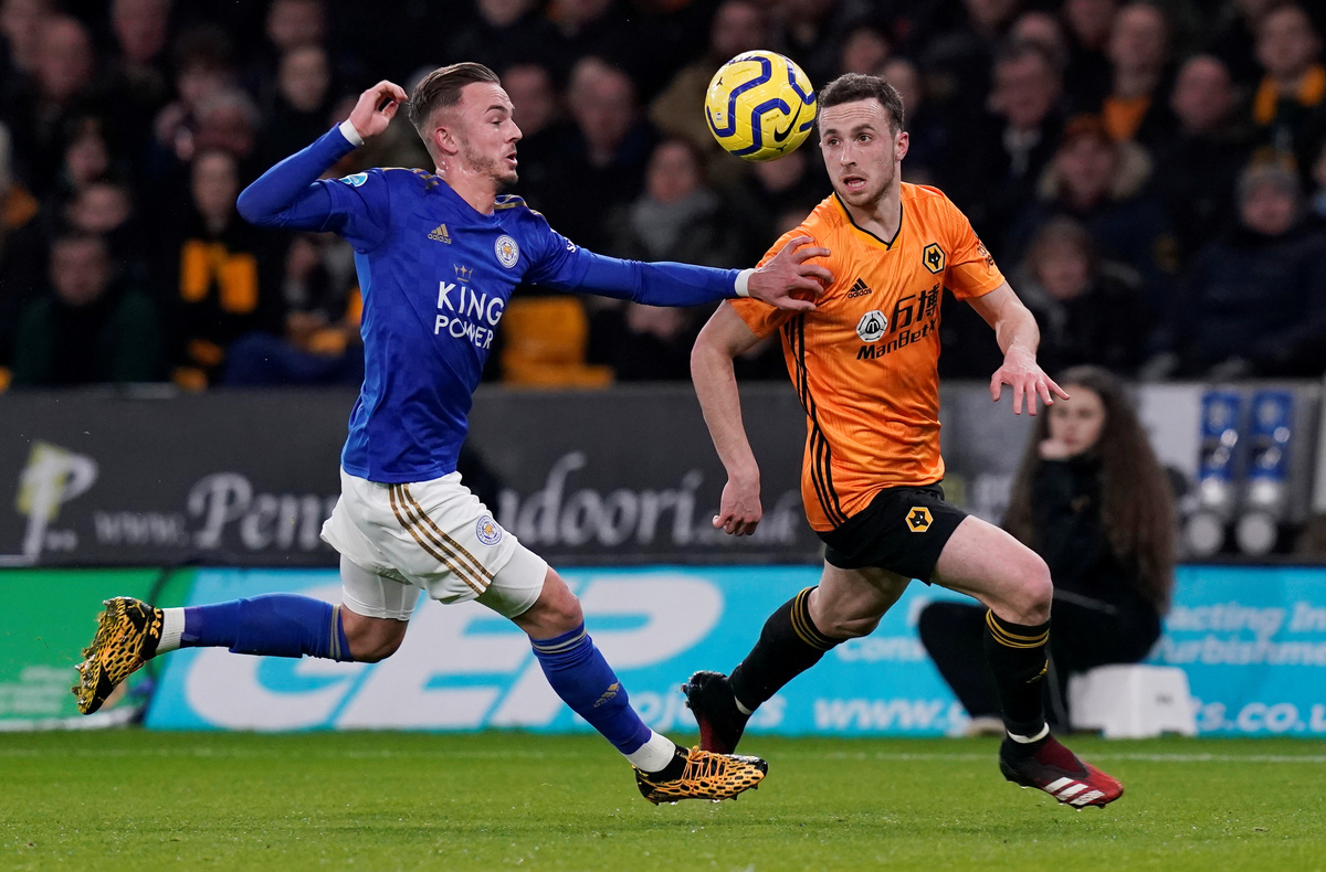 Soccer Football - Premier League - Wolverhampton Wanderers v Leicester City - Molineux Stadium, Wolverhampton, Britain - February 14, 2020 Wolverhampton Wanderers' Diogo Jota in action with Leicester City's James Maddison REUTERS/Andrew Yates
