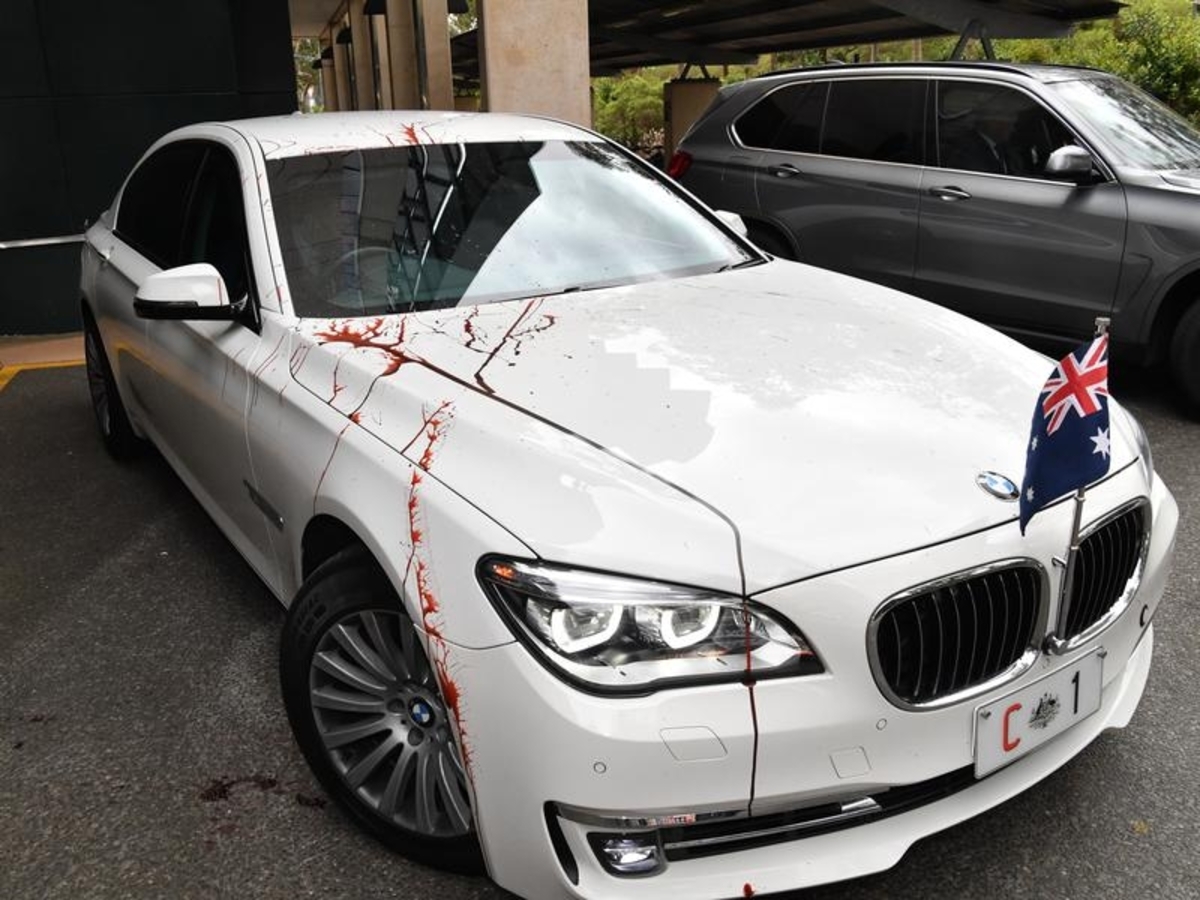 Lancaster also squeezed red paint from a bottle onto the windscreen and bonnet of the prime minister's car before smearing it all over the vehicle.