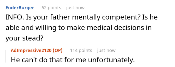The poster needed to get a surgery and insisted that her dad come and see her, which her mother opposed