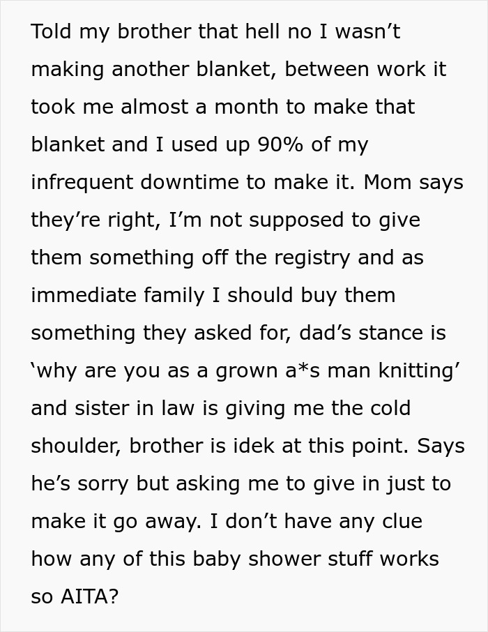 The OP’s sister-in-law made sure that people knew what she wanted to get by registering for gifts, but the redditor admitted to not being in a position where he could buy anything from it. So he decided to create a gift with his own hands, which, in fellow netizens’ eyes, didn’t make him a jerk at all; they shared their views in the comments.