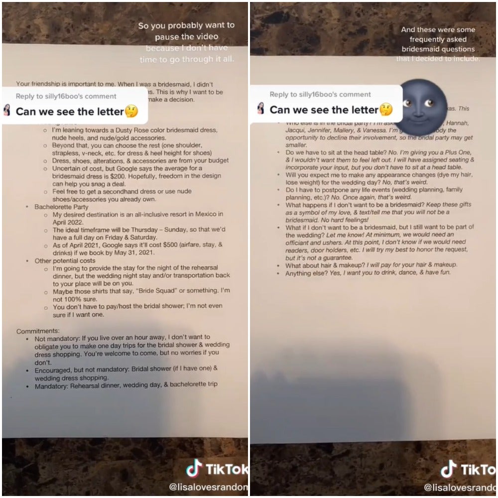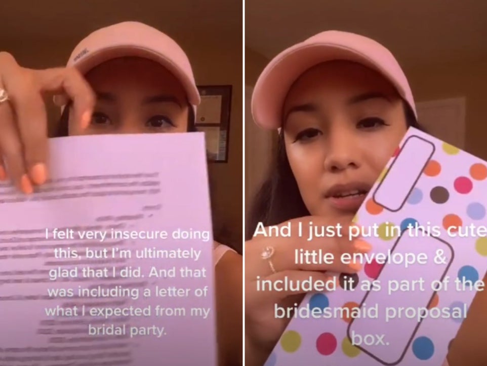 One woman on TikTok has shared how gave “transparency letters” to her friends about what they can expect from being her bridesmaid.