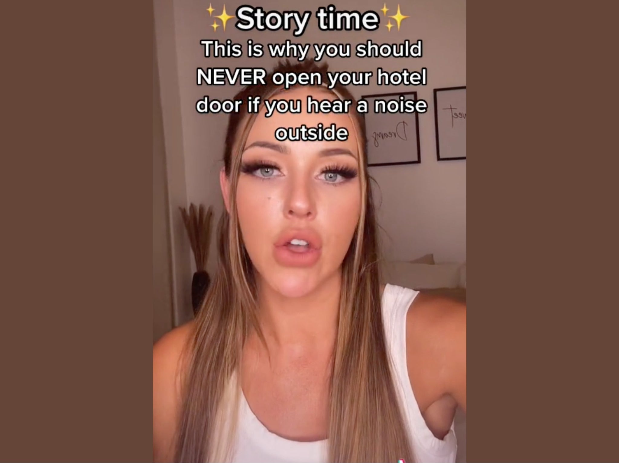 The story starts with her warning viewers: “This is why you should NEVER open your hotel door if you hear a noise outside.”