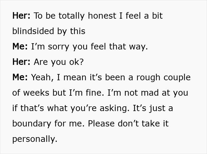 “You are not ‘mean,’ ‘cold,’ or ‘selfish’ for needing boundaries,” adds Zanzal. “If they react negatively or give the silent treatment, a good question to ask is, ‘Is this relationship worth saving? Is this the type of person I want to hang out with?'”