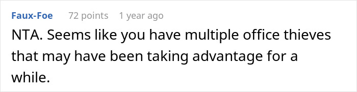 There are, for example, products online that can make one’s lunch look less appealing, but this means more costs and, at the end of the day, won’t really trick anyone, because who brings a moldy sandwich into work? At the end of the day, the one thing that helped this woman is also the key for everyone else. Some normal humans stepping up against theft and calling people out for being terrible.