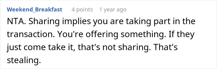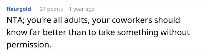 Similarly, just because a person has shared in the past doesn’t mean that one is now entitled to their things for the rest of time. Taking someone’s stuff when they aren’t around and haven’t told you it’s ok is just theft, plain and simple. After all, what if this was an after work snack? What if she brought in a birthday cake for a later event and they just took it? This is not how life works.
