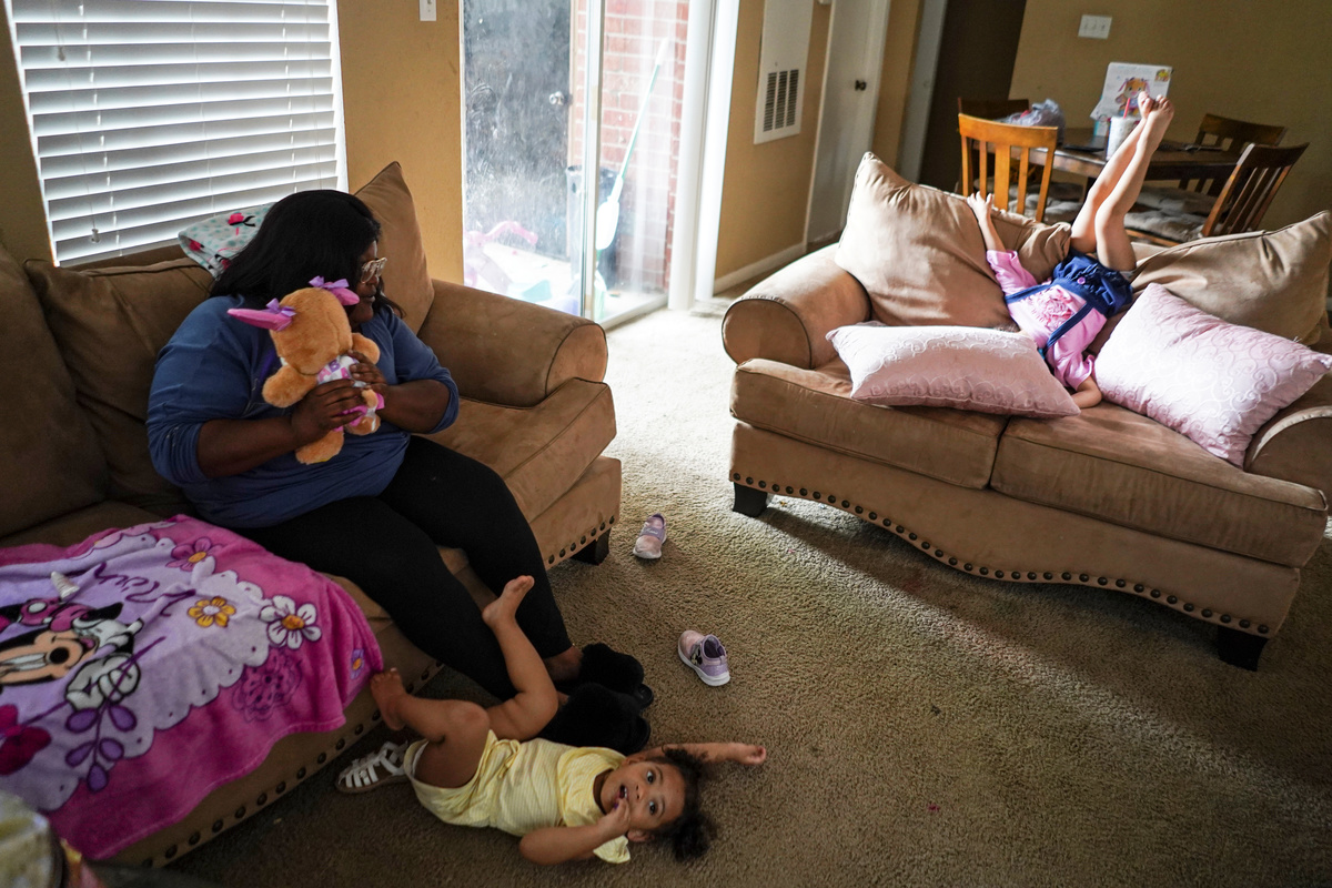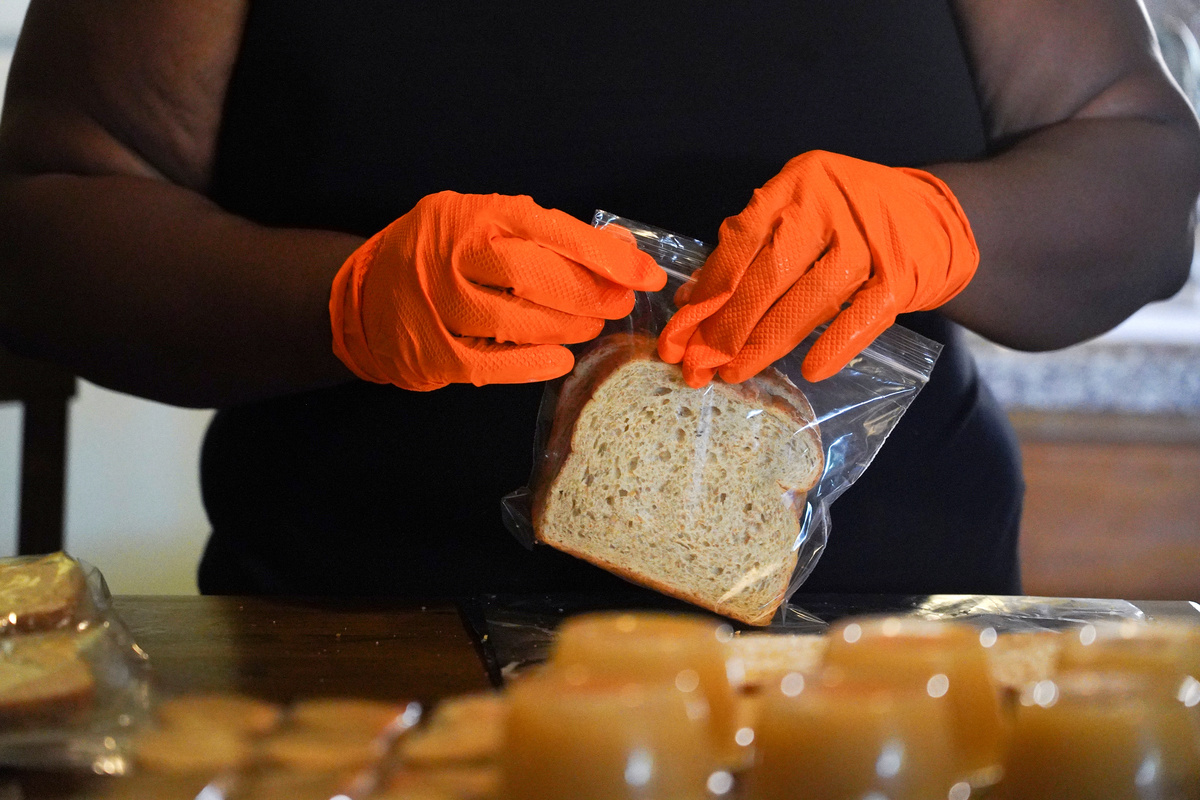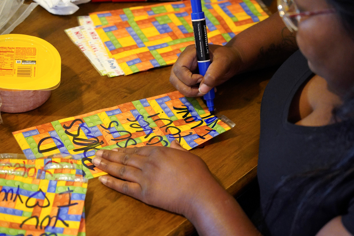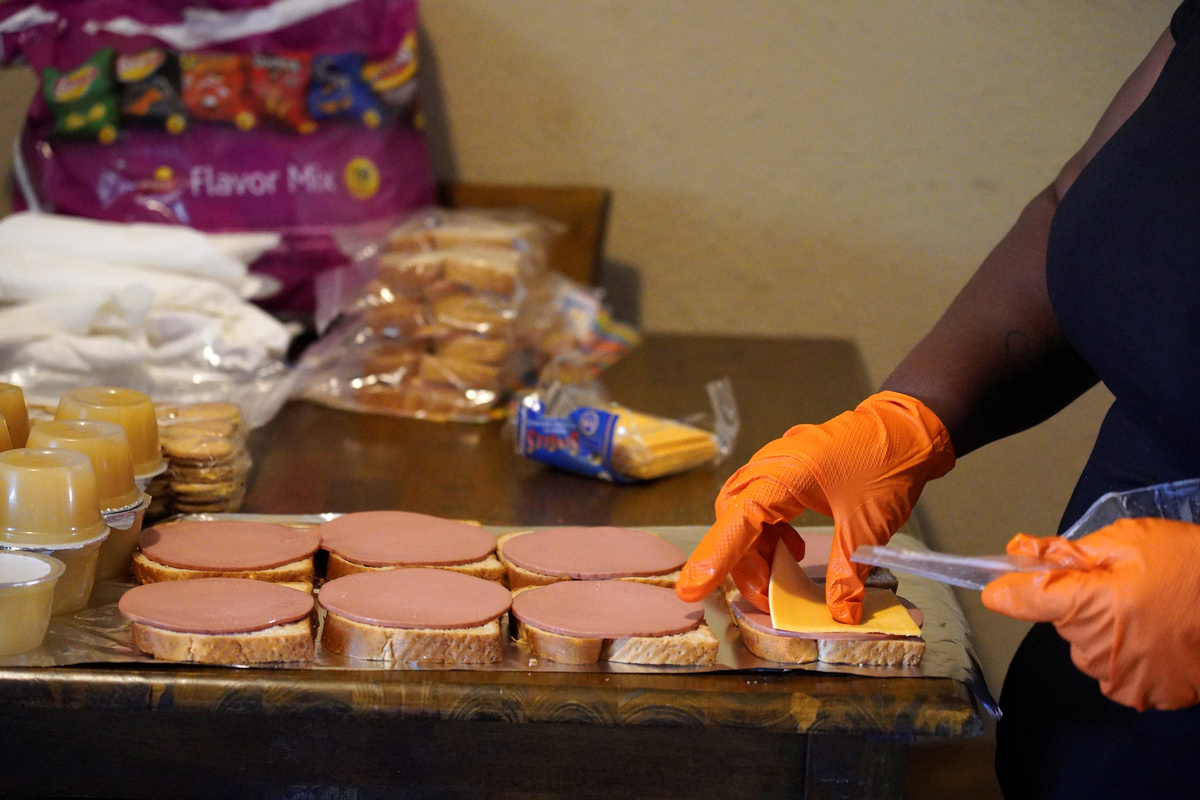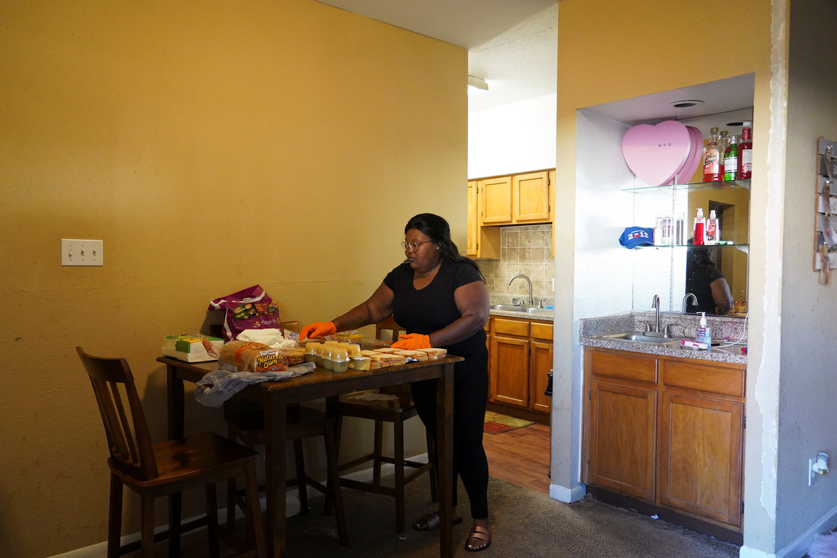 Walton buys the groceries herself or uses leftovers from her employer, making the bags in her sister's apartment, where her 1-year-old and 4-year-old nieces play.