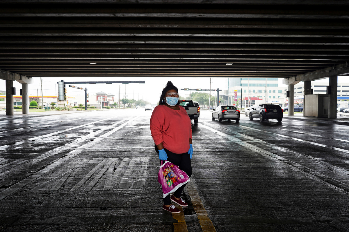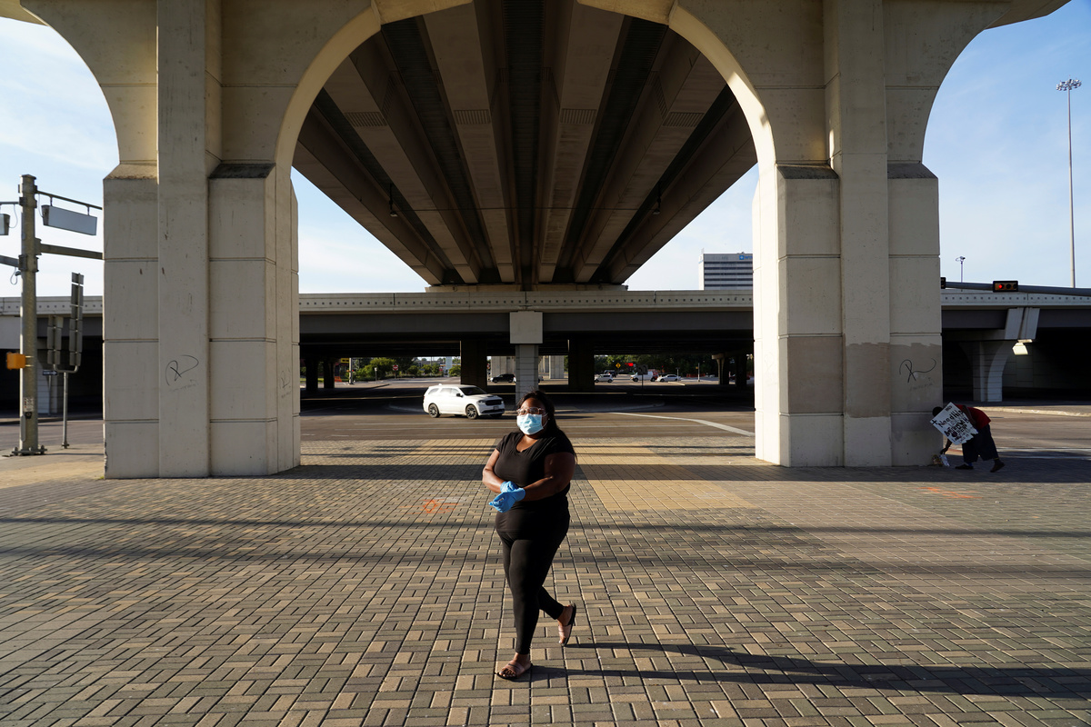 FILE PHOTO: Dominick Walton, who is homeless herself, poses as she crosses a road to serve food to homeless people amid the coronavirus disease (COVID-19) outbreak in Houston, Texas, U.S., April 19, 2020. REUTERS/Go Nakamura