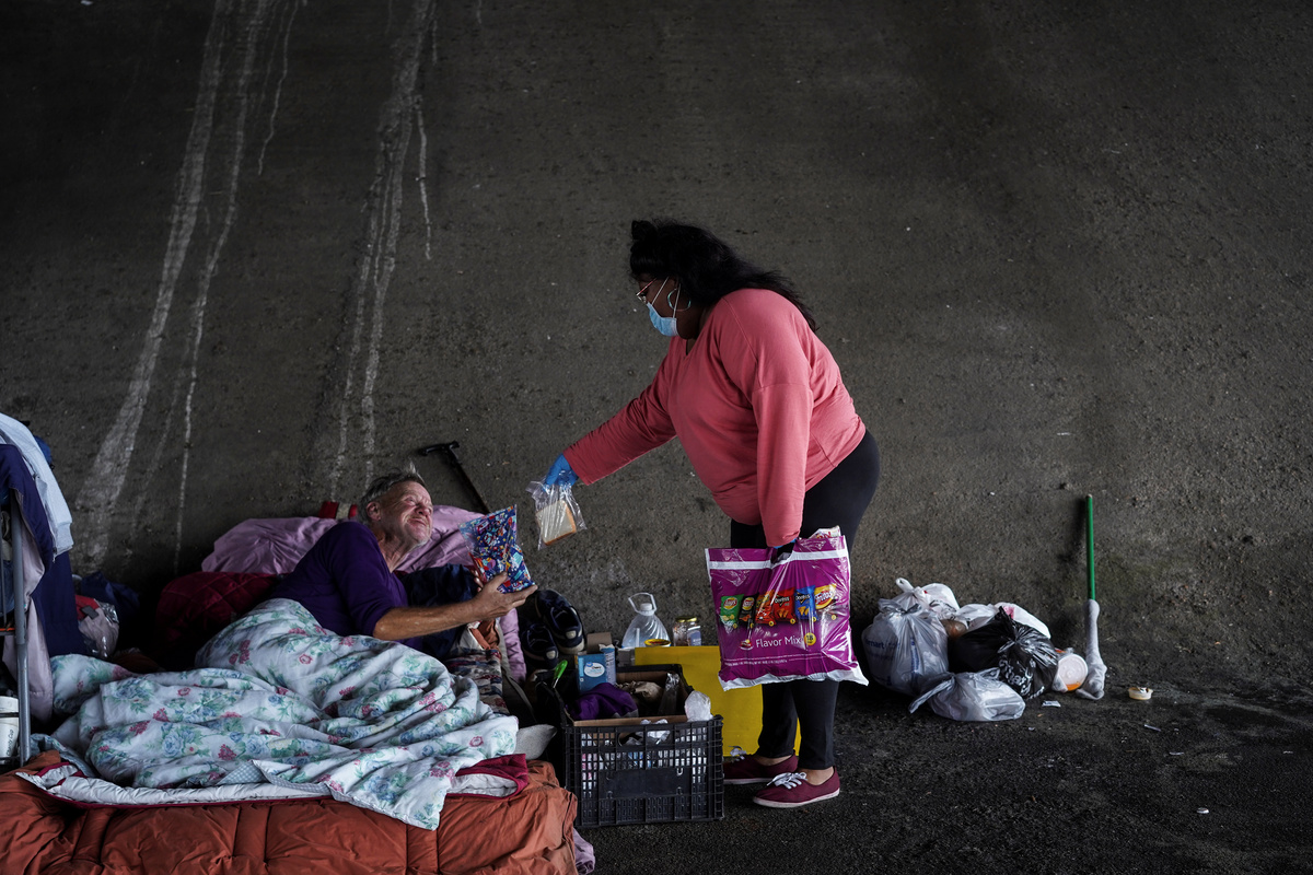 FILE PHOTO: Dominick Walton, who is homeless herself, leaves food bags for homeless people amid the coronavirus disease (COVID-19) outbreak in Houston, Texas, U.S., April 19, 2020. REUTERS/Go Nakamura