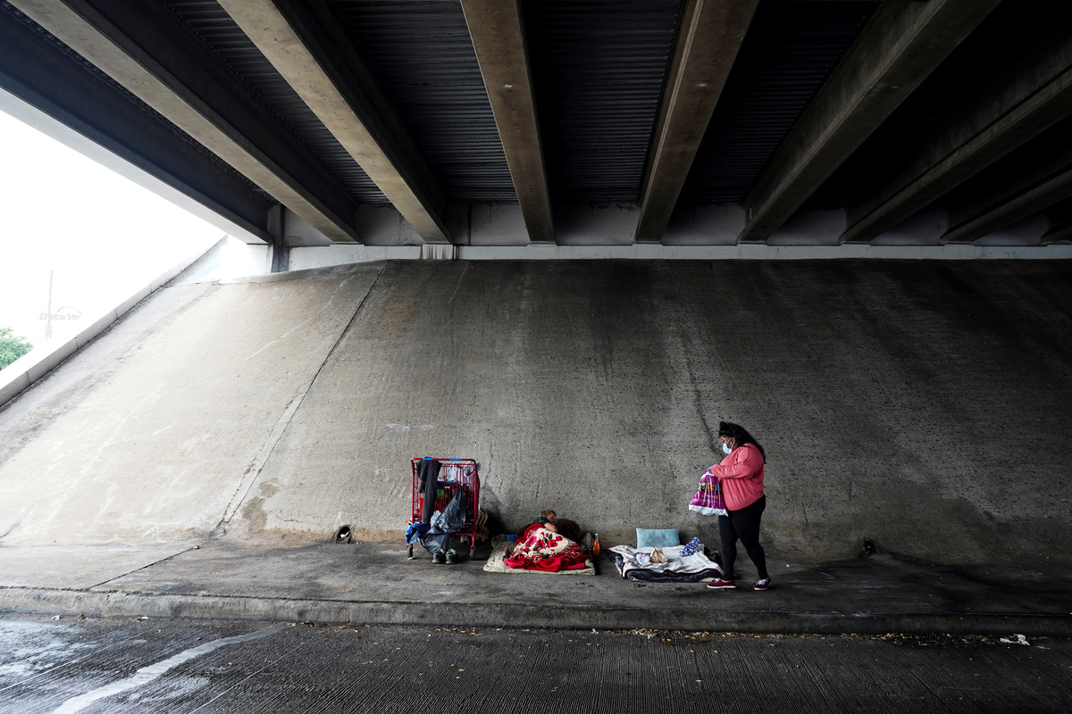 Dominick SeJohn Walton spots a man with a shopping cart piled high with belongings and a sign that says "Homeless. Please Help" under a Texas highway overpass. With the coronavirus keeping many at home, the road is quieter than usual.