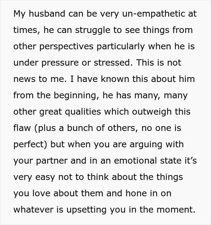 People in the comments were clear that they don’t think she overreacted. In their eyes, her reaction was completely justified. Also, for some of the commenters, the thing that didn’t sit right was not so much the action of the husband, but his reaction to his wife’s expressed feelings.