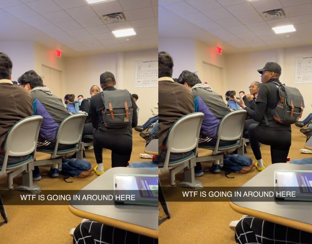 In a TikTok video posted on January 27, Vick Todaro shows a man on his knees and talking to one of the students, who is sitting at her desk. As he’s bent down, he begins to explain to the woman why he likes her.