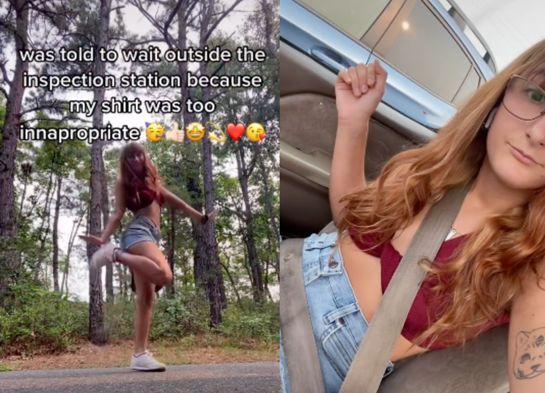 In a viral TikTok video that has been viewed more than one million times, Tia Wood says that she was “told to wait outside the inspection station because my shirt was too inappropriate.”