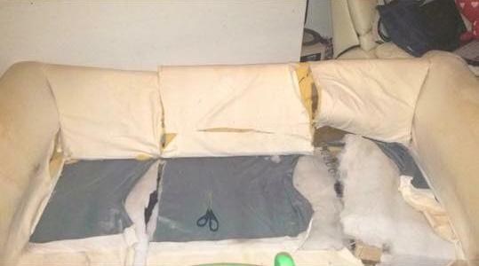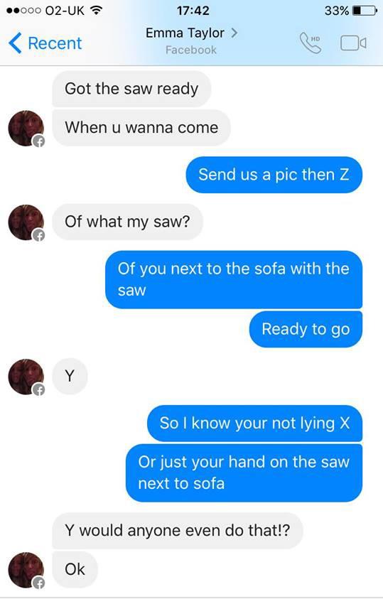 After convincing the seller he wanted the chopped up sofa was for an art project, this joker asked Ms Taylor to send over some pictures of her posing next to the couch, wielding her saw before chopping, “just so [he was] sure.”