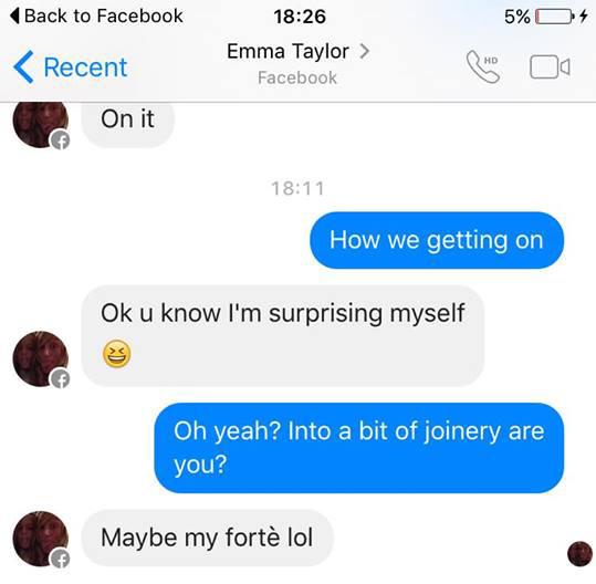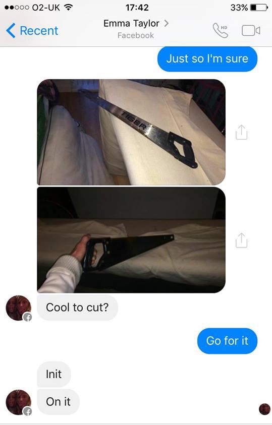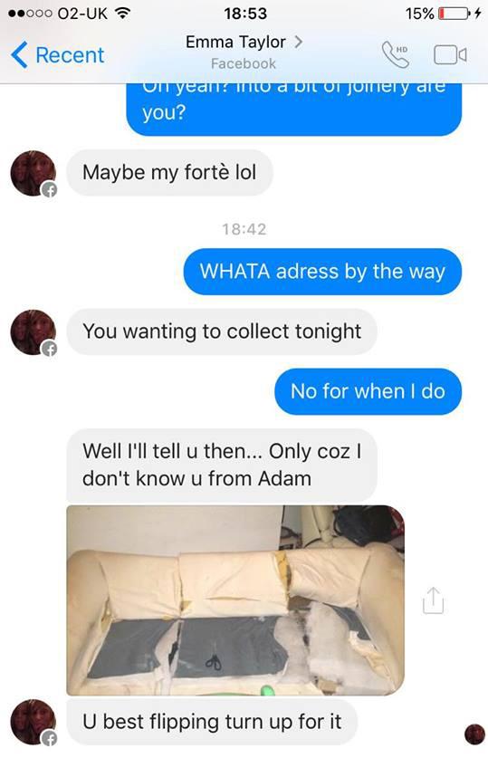 But 21-year-old Facebook fiend Joe Cordingly had actually taken offence to Ms Taylor’s sales techniques, and decided to step in, after seeing her try to “sell [the] piece of shit relentlessly.” Ms Taylor, of St Annes in Lancashire, didn’t blink an eyelid when Mr Cordingley got in touch with her online, and wasted no time in asking if she’d saw her sofa into pieces.