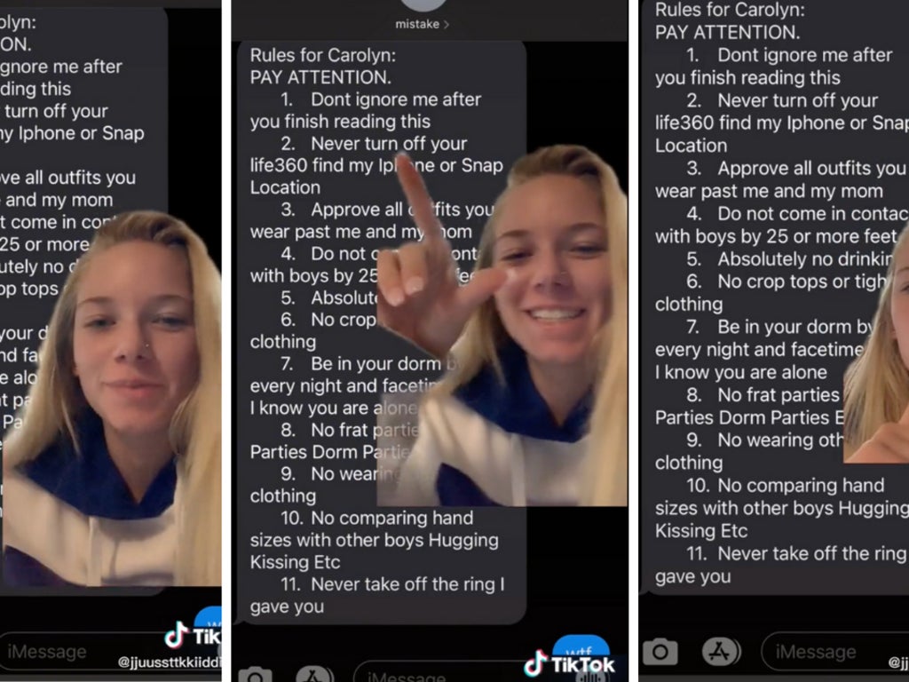 “Don’t ignore me after reading this”; “never turn off your life360, find my iphone, or Snap location”; “approve all outfits you wear past me and my mom”; “do not come in contact with boys by 25 or more feet”; “absolutely no drinking”; “no crop tops or tight clothing”; “be in your dorm by 9pm every night and facetime me so I know you are alone”; “no frat parties, house parties, dorm parties etc”; “no wearing other boys clothing”; “no comparing hand sizes with other boys, hugging, kissing etc”; and finally “never take off the ring I gave you”.